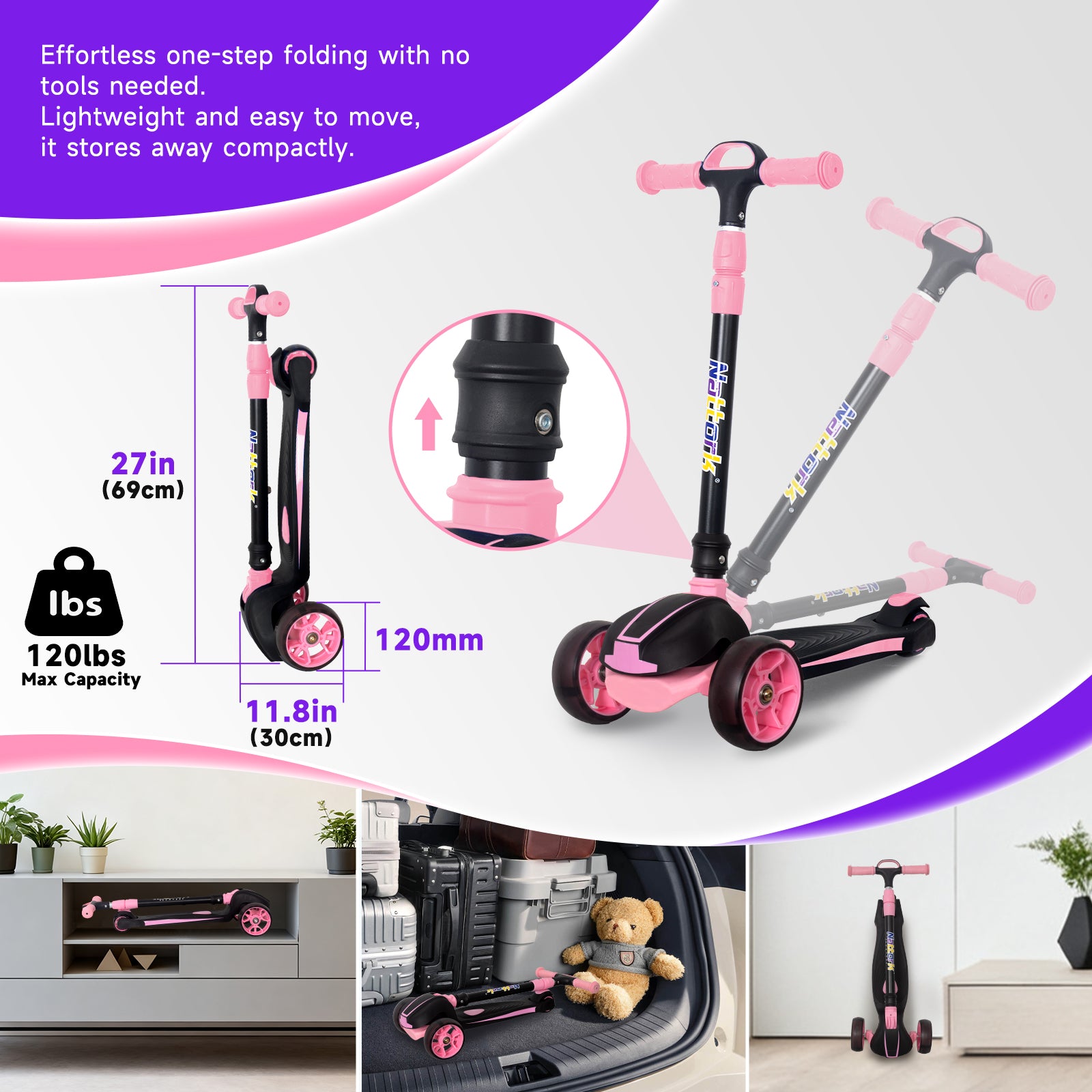 - 1 × Nattork Foldable Light-Up 3-Wheel Scooter (Pink)