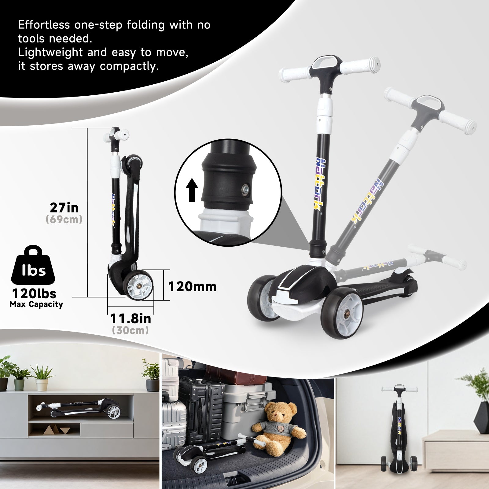 Meet the Nattork Foldable Light-Up 3-Wheel Scooter, the ultimate ride for kids and toddlers ages 3–12. Designed for both indoor and outdoor fun, this vibrant white scooter blends safety, comfort, and excitement to keep your little one active and smiling every day. Whether they’re just learning to balance or already zooming with confidence, this scooter grows with them — thanks to its adjustable height and sturdy build. With a weight capacity of up to 120 lbs, it’s built to last through years of play and growth.