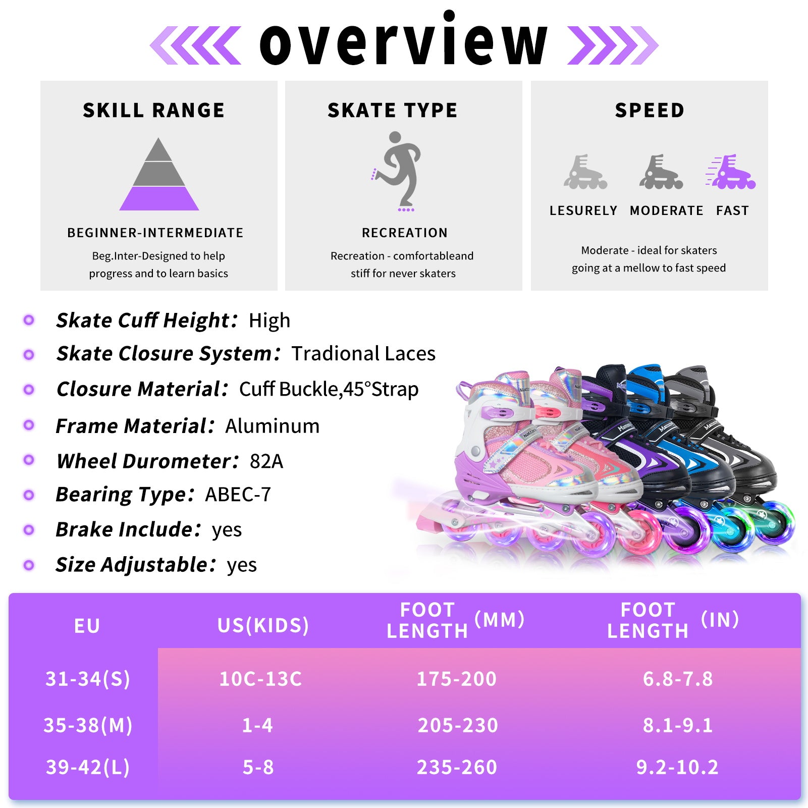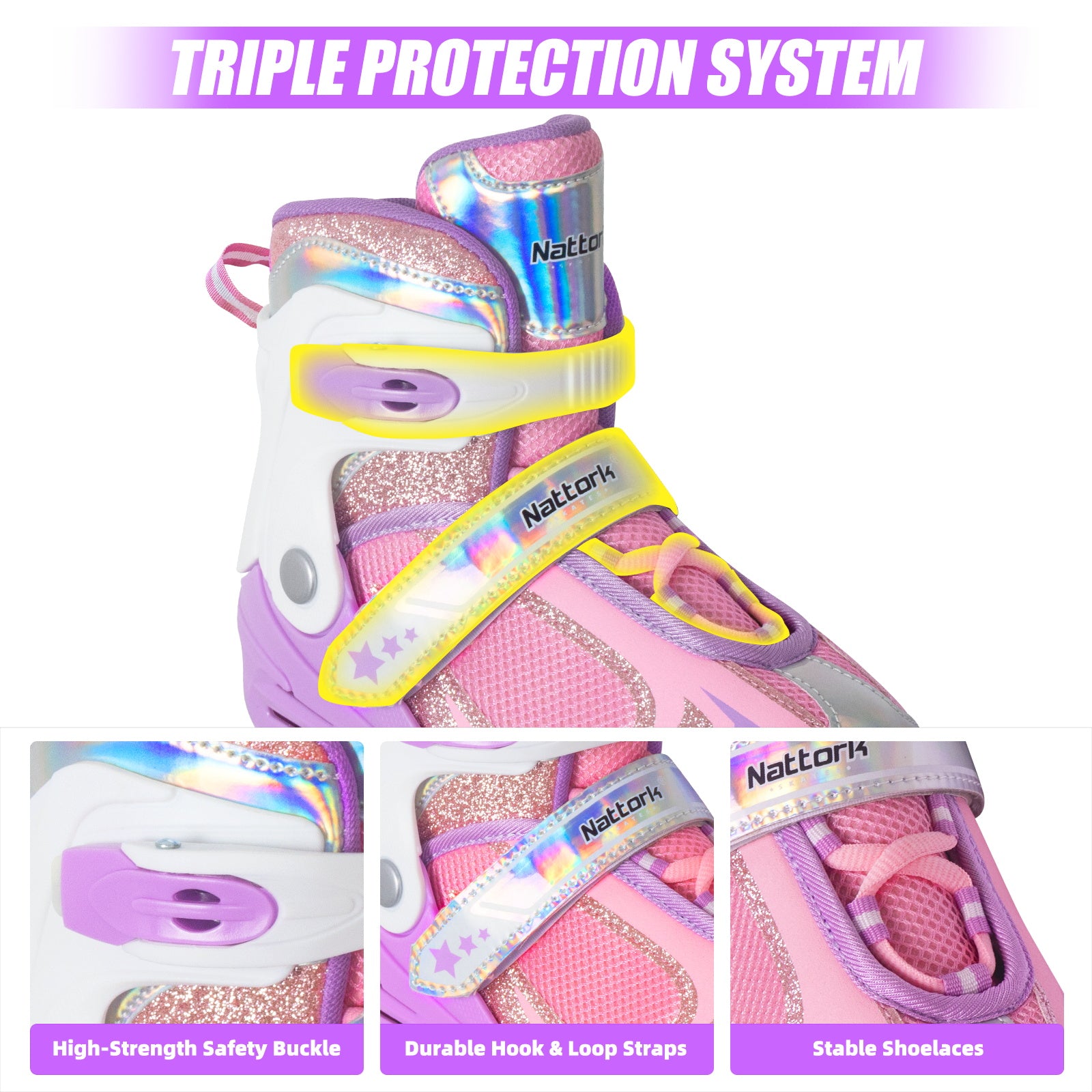 The Nattork Kids inline skates epitomize both durability and performance. Furnished with high-elasticity wheels and ABEC-7 bearings, these skates guarantee a consistent and smooth glide across diverse terrains, empowering young skaters to broaden their skating horizons with confidence.