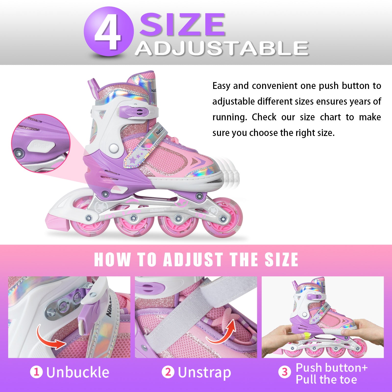 Most Nattork skates are adjustable across 4 sizes, so they can grow with your child — simply press the size-adjust button to extend the skate as their feet grow.
