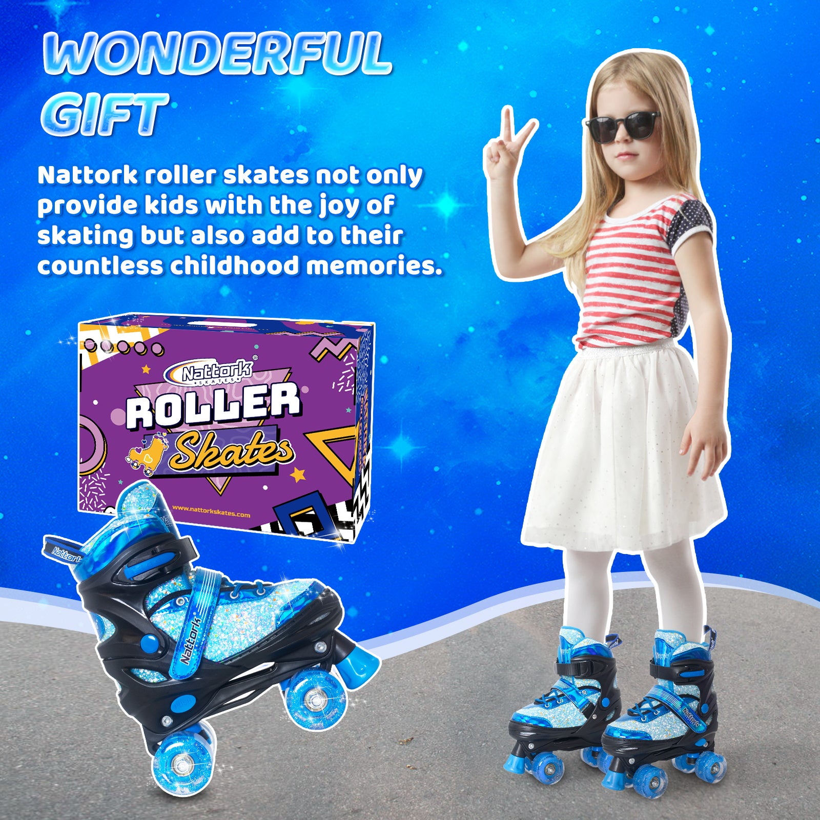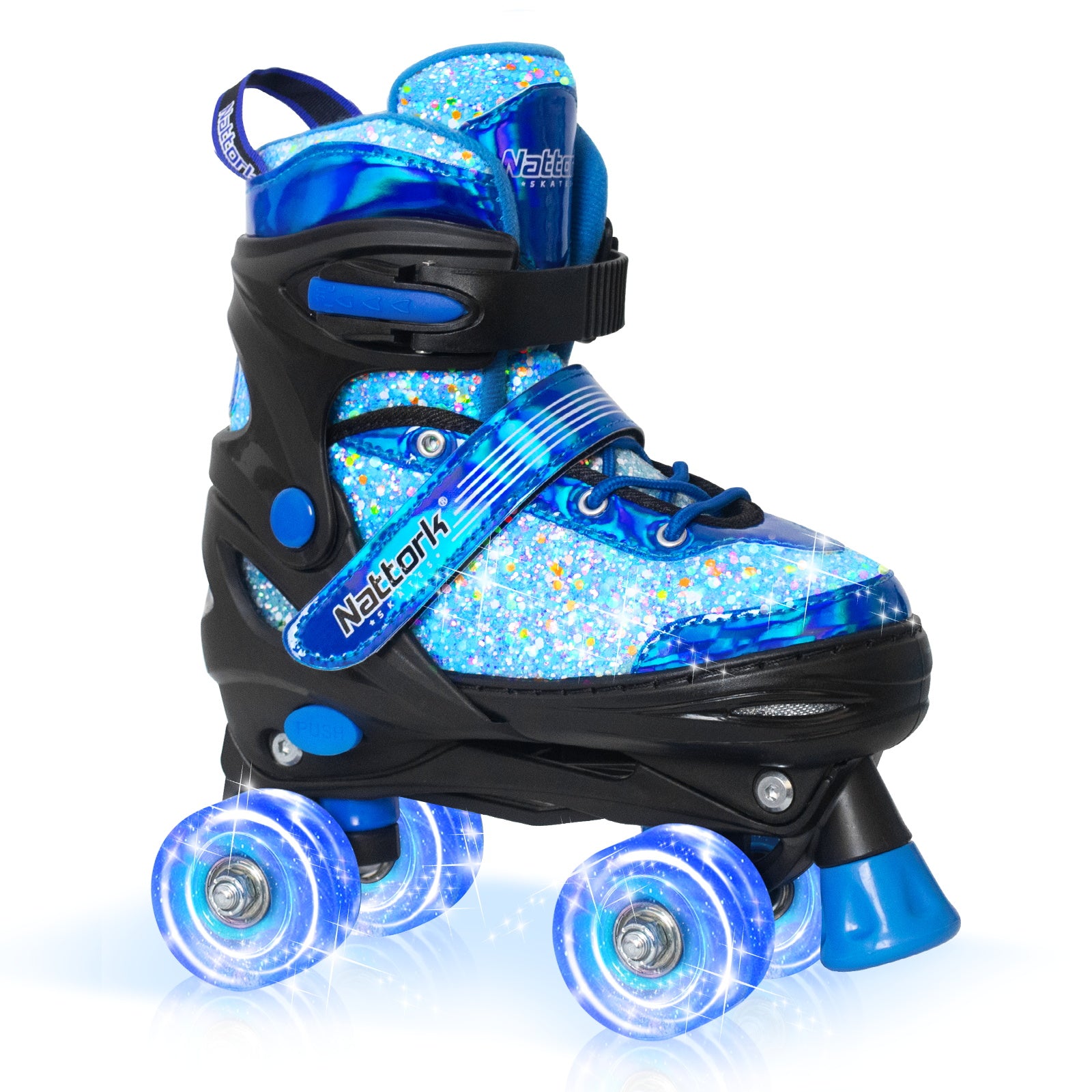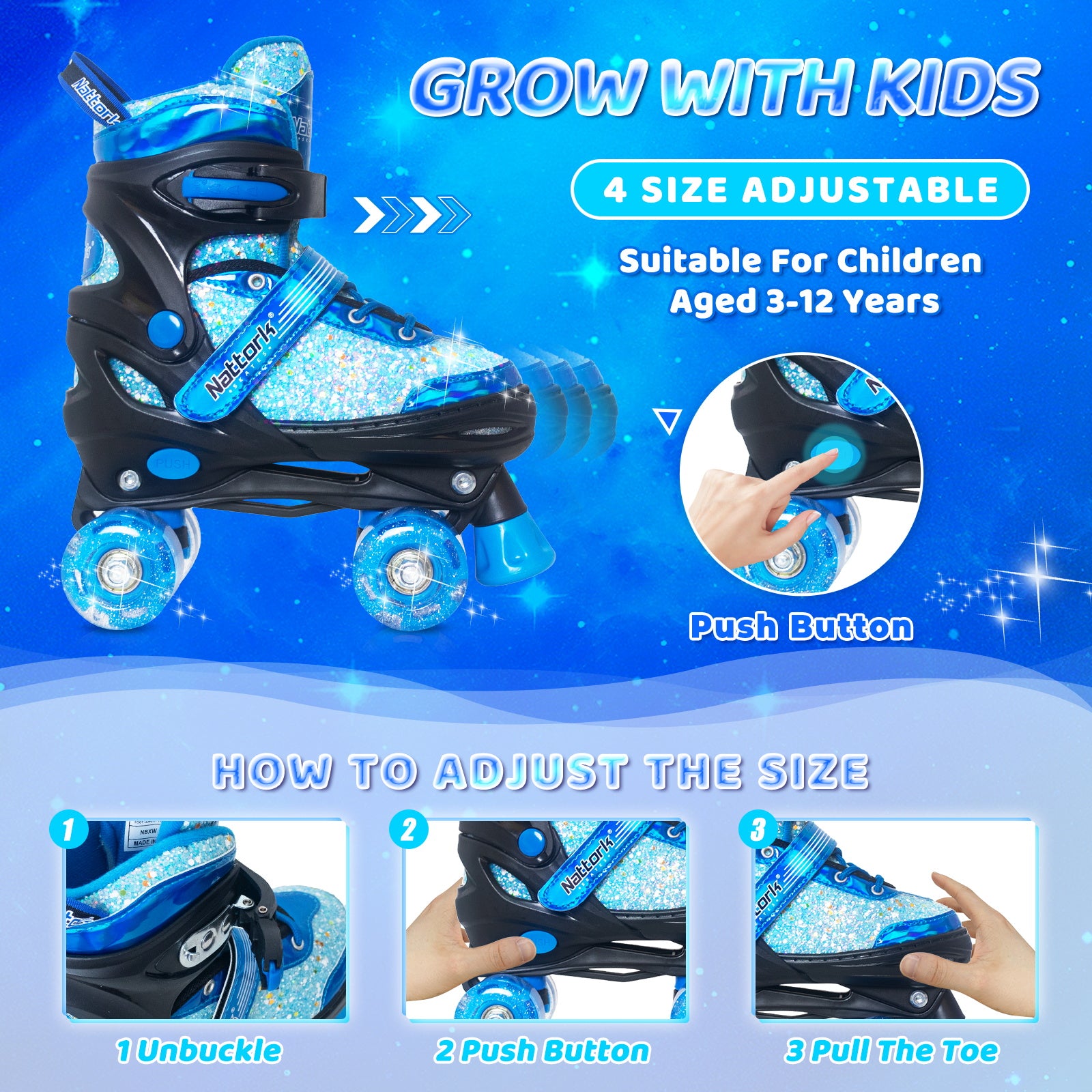 4-Size Adjustable Roller Skates - Nattork Frosty Blue roller skates adapt to four different sizes with an easy button adjustment, allowing these skates to grow alongside your child. No need for frequent replacements—perfect for parents and kids alike!