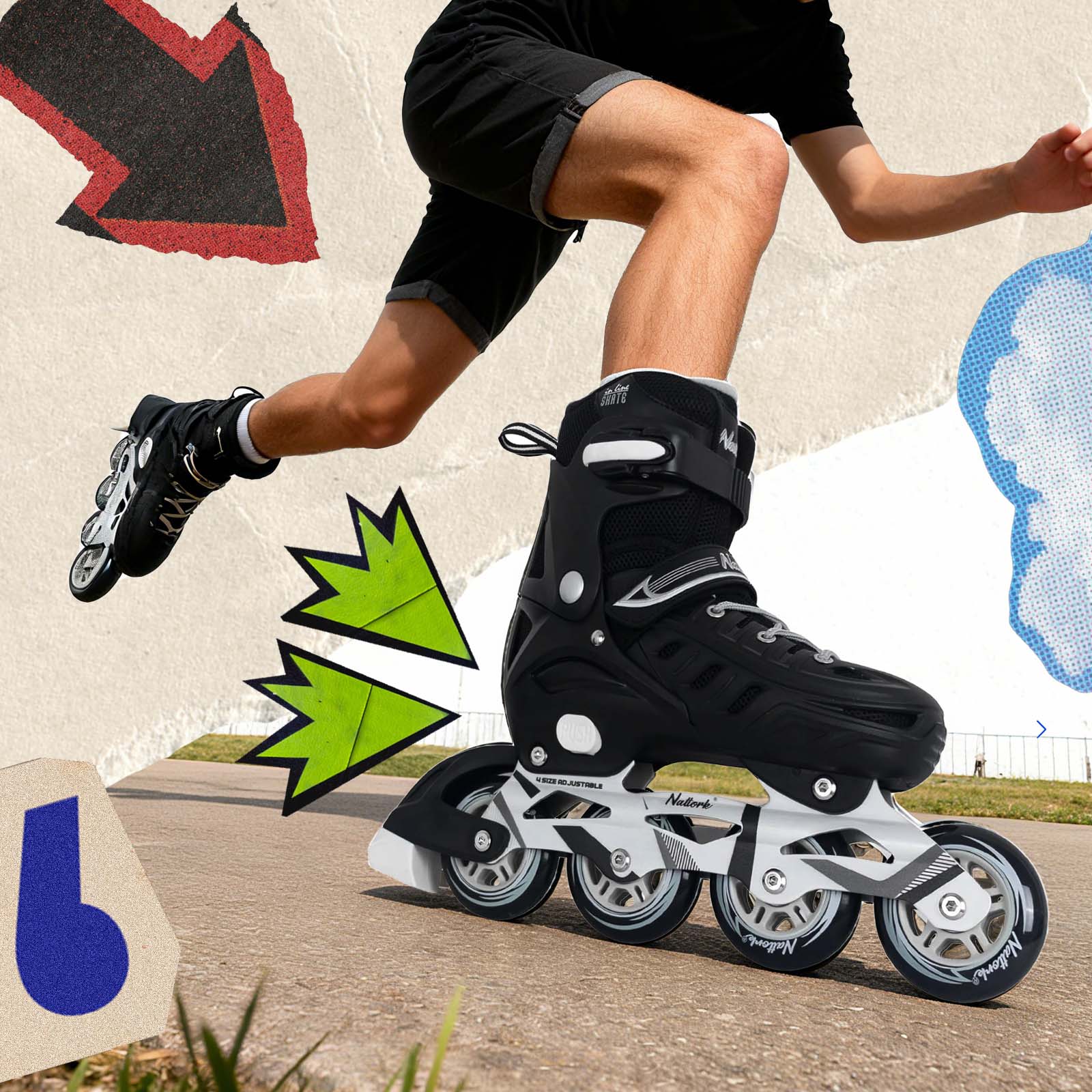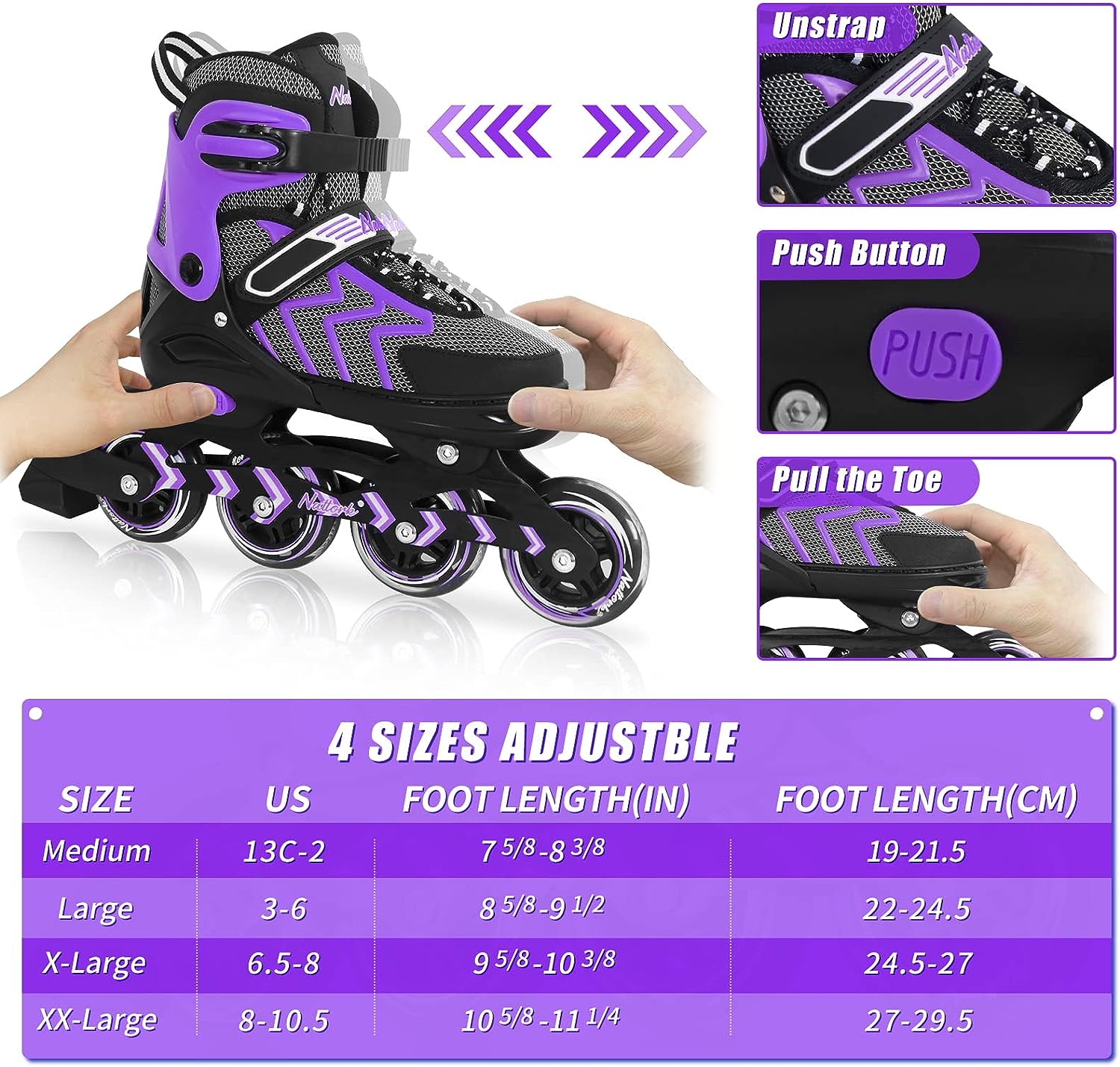 Most Nattork skates are adjustable across 4 sizes, so you can even share with your family and friends — simply press the size-adjust button to extend the skate.