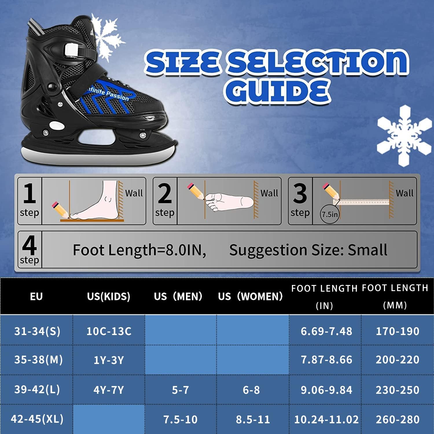 Experience the perfect blend of comfort, safety, and style with our ice skates designed for young adventurers. The adjustable sizing feature sets these skates apart, offering versatility in four sizes (S, M, and L) with four adjustable gears in each size. This ensures an impeccable fit as your child's feet grow, delivering both comfort and a secure fit throughout their entire skating journey.