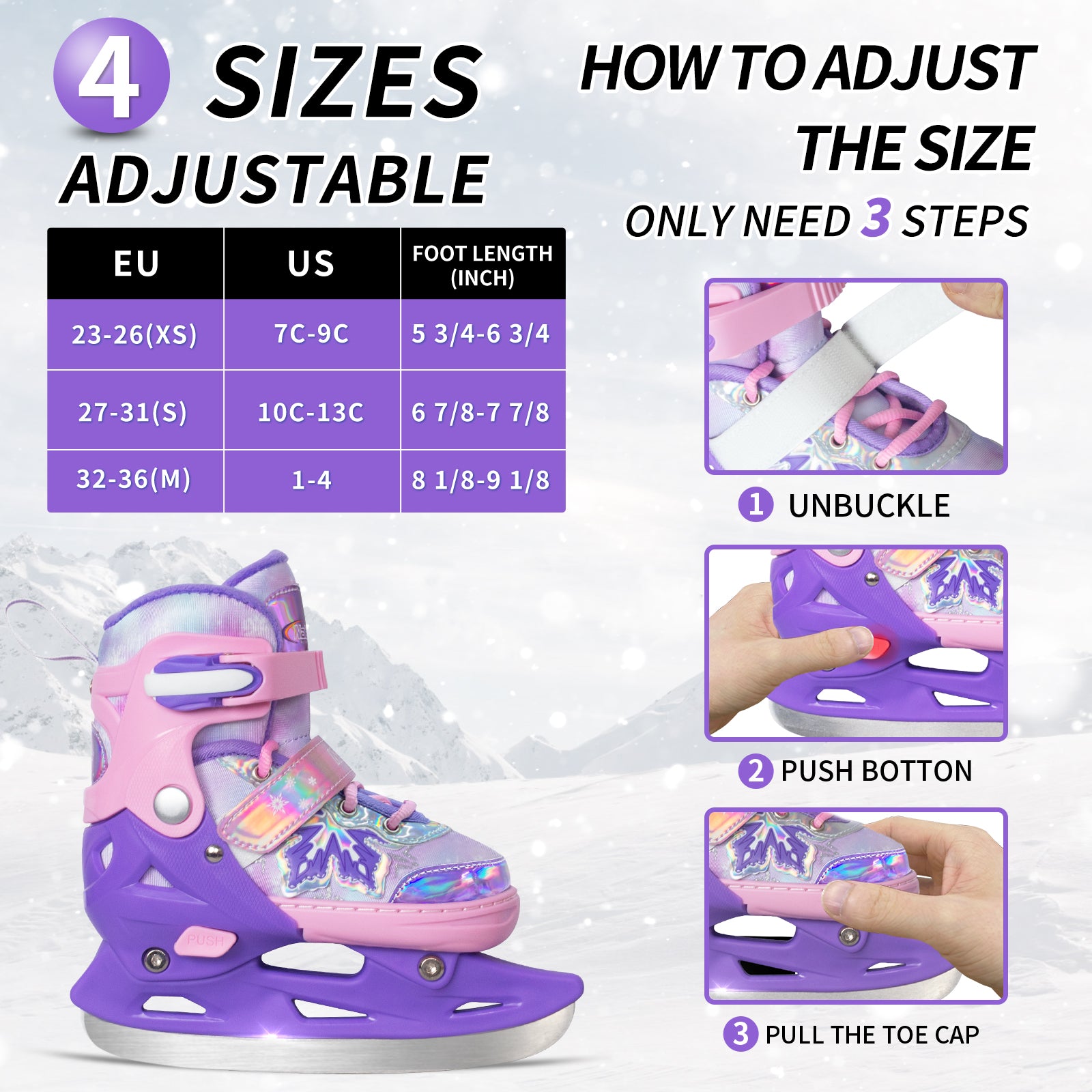 No more outgrowing skates too soon! With a simple one-button adjustment, these ice skates expand to four sizes, making them the perfect long-term companion for your child’s skating journey.
