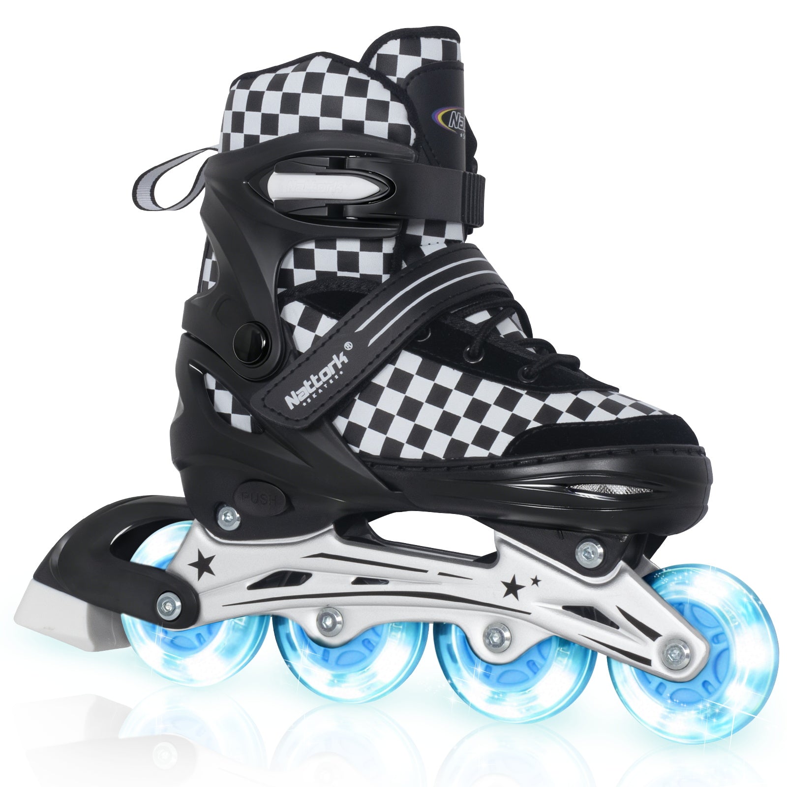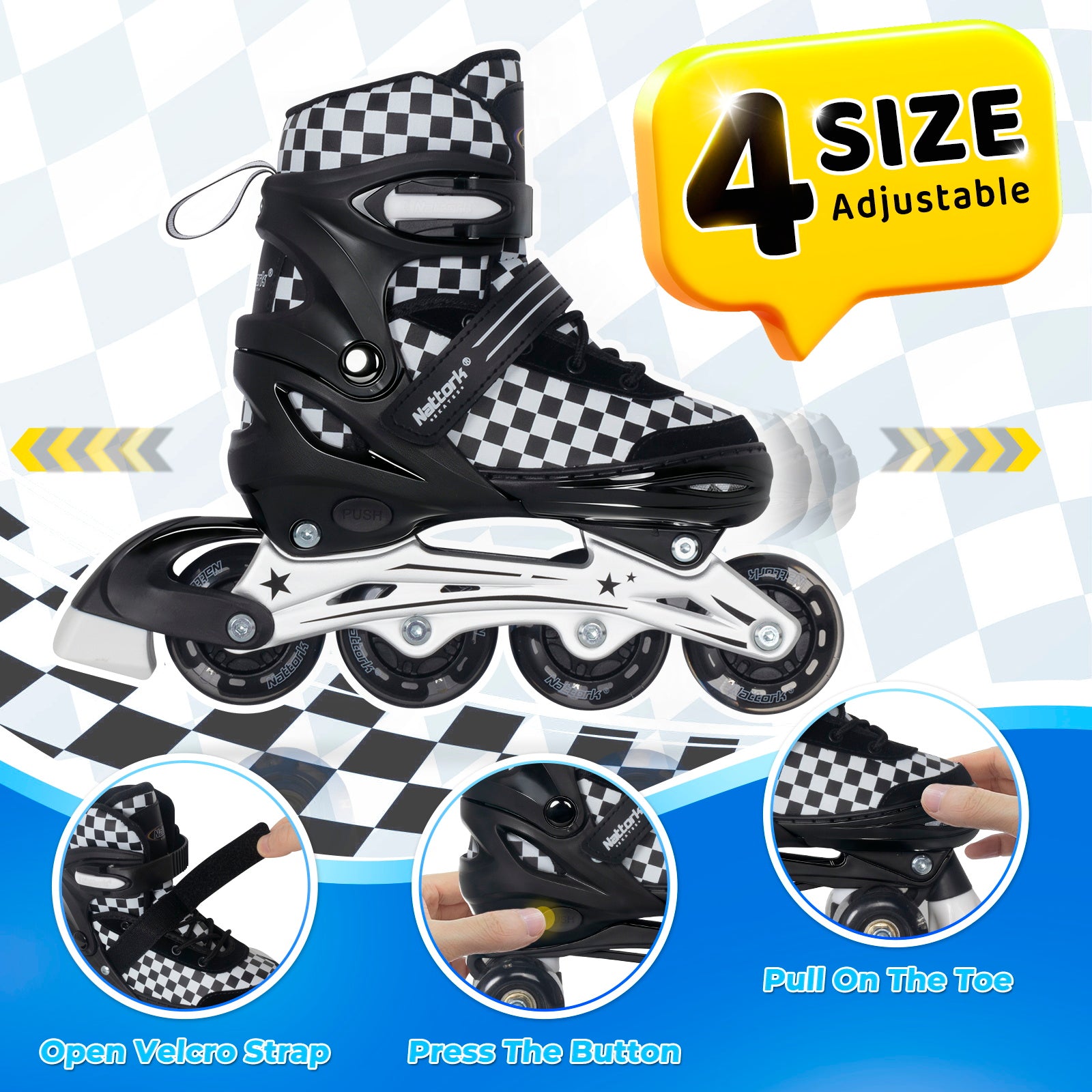 Most Nattork skates are adjustable across 4 sizes, so they can grow with your child — simply press the size-adjust button to extend the skate as their feet grow.