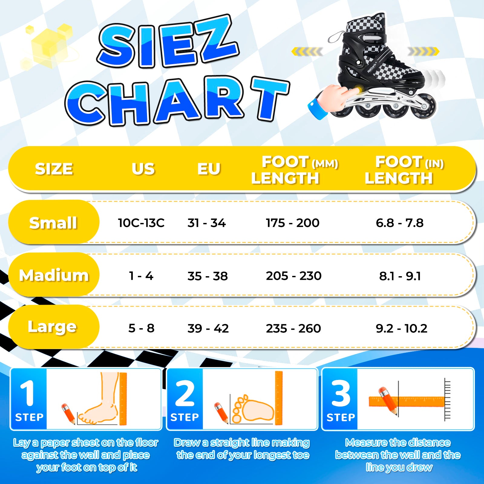 Designed with a stylish checkerboard pattern and available in multiple bold color options, these kids inline skates stand out from the crowd. The sleek black frame paired with the retro-inspired design gives a cool, modern look that kids and teens can’t get enough of.