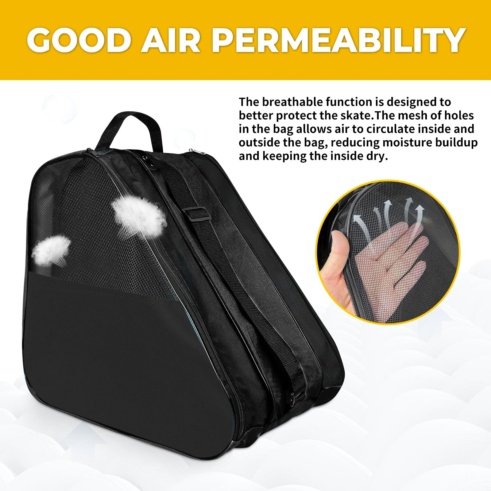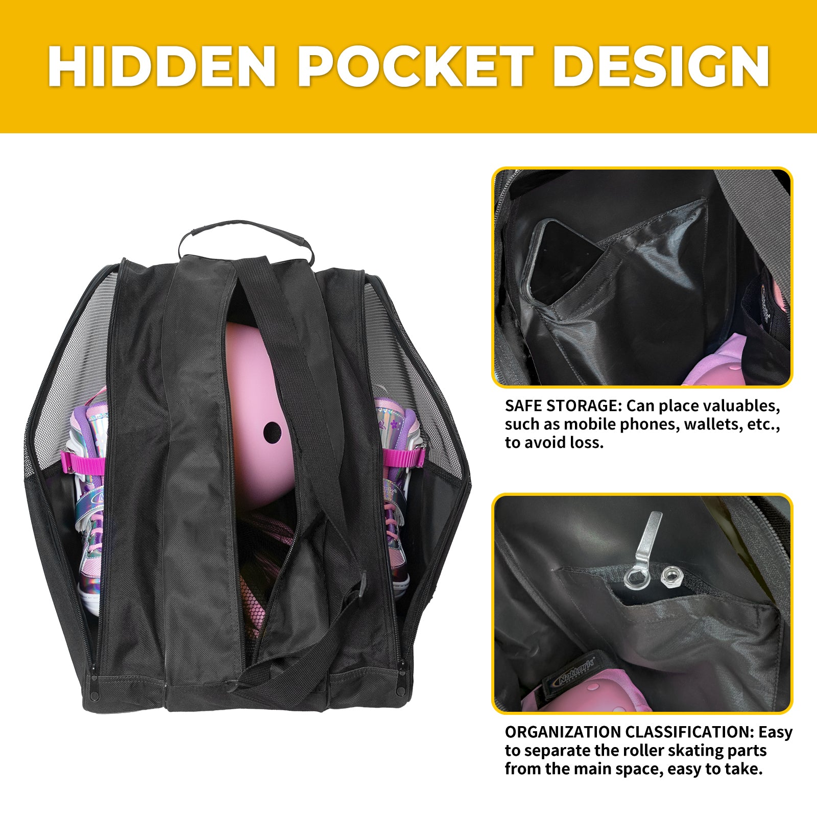 BREATHABLE MESH: Featuring hexagonal mesh fabric on the top half of the side pockets, this bag promotes ventilation for your skates, preventing odors and keeping them fresh after use.