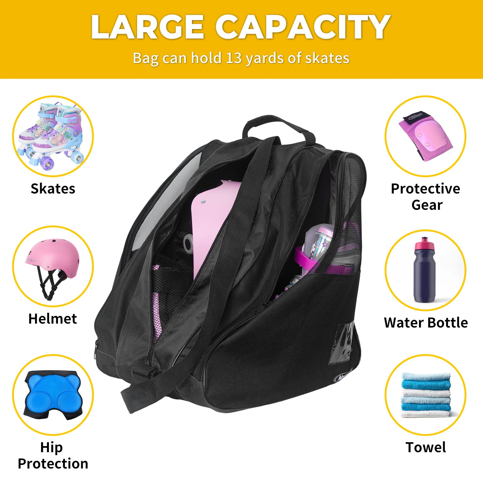 MULTIFUNCTIONAL DESIGN: Personalize your bag with a name card or your favorite character card in the convenient card pocket. With three outer pockets and two inner pockets in the main compartment, you can easily organize not just your skates but also protective gear, towels, clothing, mobile phones, wallets, and more. Plus, there's a handy bottle pocket at the back to keep you hydrated on the go!