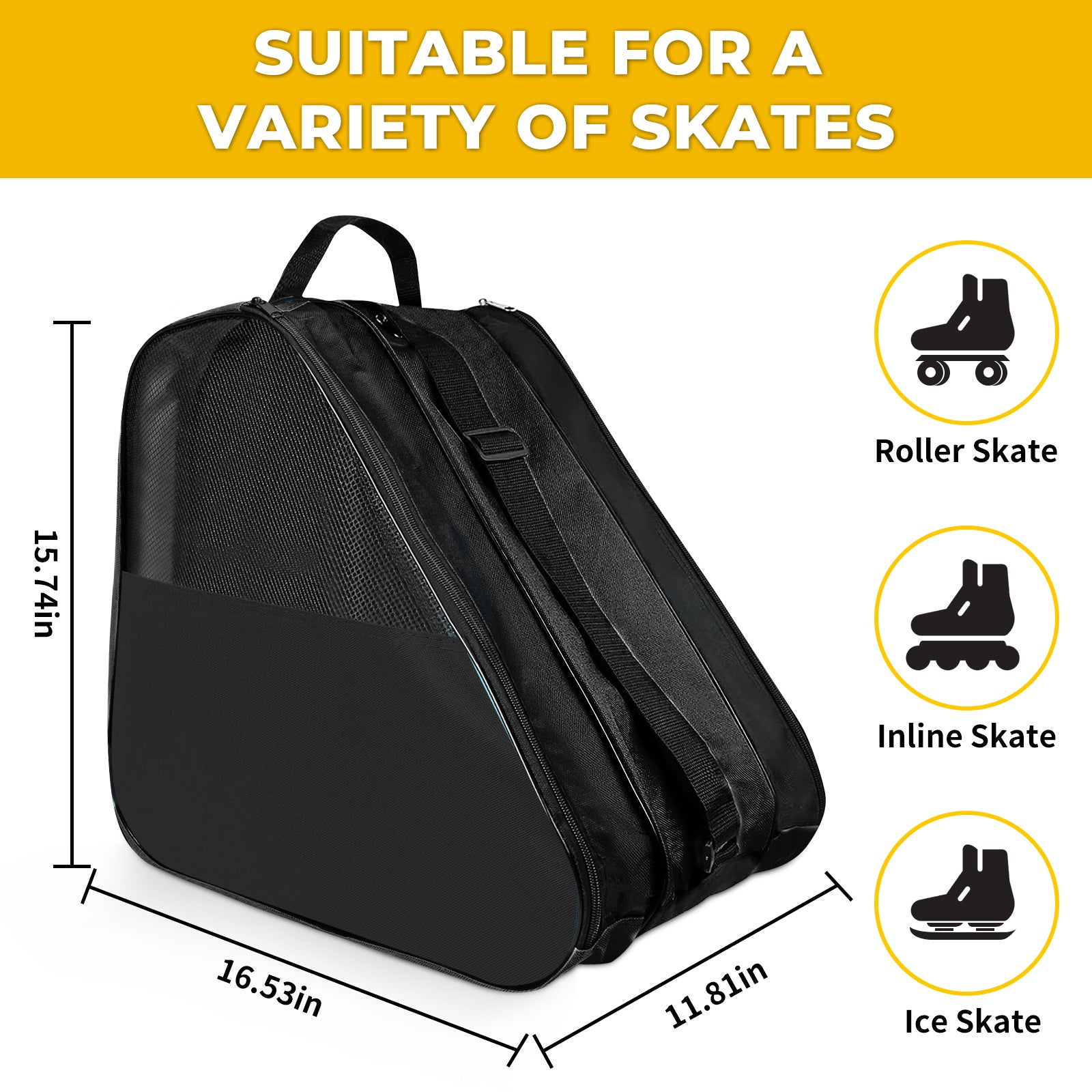 EASY TO CARRY: The adjustable shoulder strap lets you customize the length for maximum comfort, allowing you to carry your skates—ice, quad, or inline—effortlessly. With both a shoulder strap and a handle, this bag is versatile for various carrying scenarios.