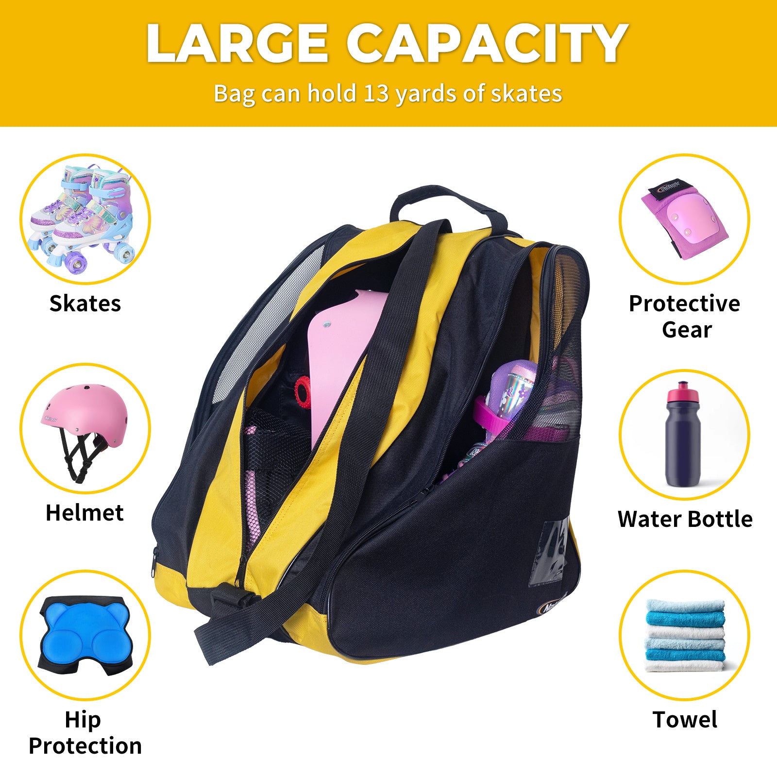 MULTIFUNCTIONAL DESIGN: Personalize your bag with a name card or your favorite character card in the convenient card pocket. With three outer pockets and two inner pockets in the main compartment, you can easily organize not just your skates but also protective gear, towels, clothing, mobile phones, wallets, and more. Plus, there's a handy bottle pocket at the back to keep you hydrated on the go!