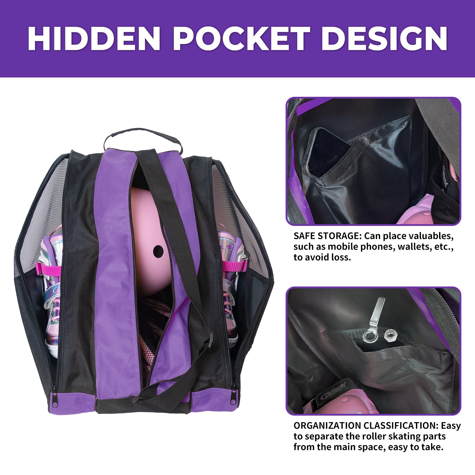 BREATHABLE MESH: Featuring hexagonal mesh fabric on the top half of the side pockets, this bag promotes ventilation for your skates, preventing odors and keeping them fresh after use.