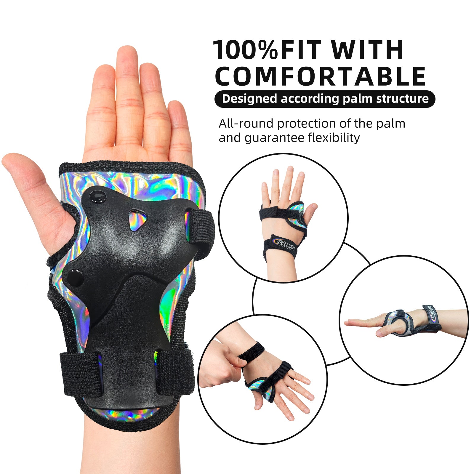 - Designed for a Secure Fit: Equipped with double elastic straps and a thumb hole on the wrist guards, these pads stay in place during all kinds of activities, from skateboarding to cycling.