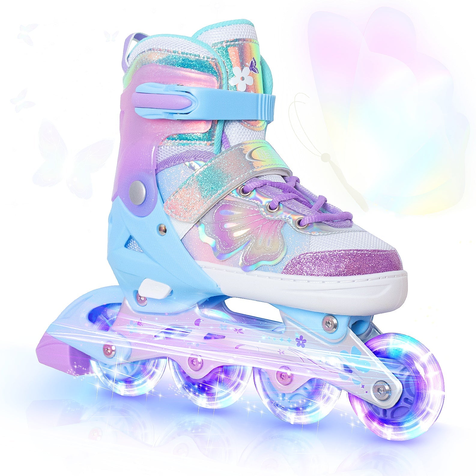 Step into a fairy tale with the enchanting "Fairy Wing" lavender butterfly wing inline skates. These exquisite inline skates blend fantasy and reality, adorned with butterfly wing decorations that evoke fairies dancing in the breeze. Perfect for beginners and kids, they seamlessly combine magical style with practical functionality. Experience ethereal elegance with every glide.