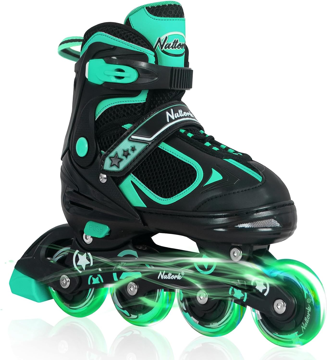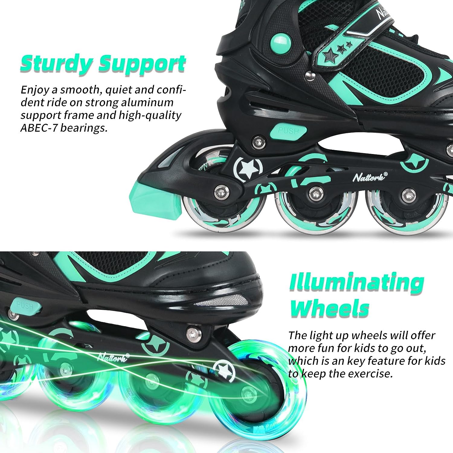 The Nattork Kids inline skates epitomize both durability and performance. Furnished with high-elasticity wheels and ABEC-7 bearings, these skates guarantee a consistent and smooth glide across diverse terrains, empowering young skaters to broaden their skating horizons with confidence.