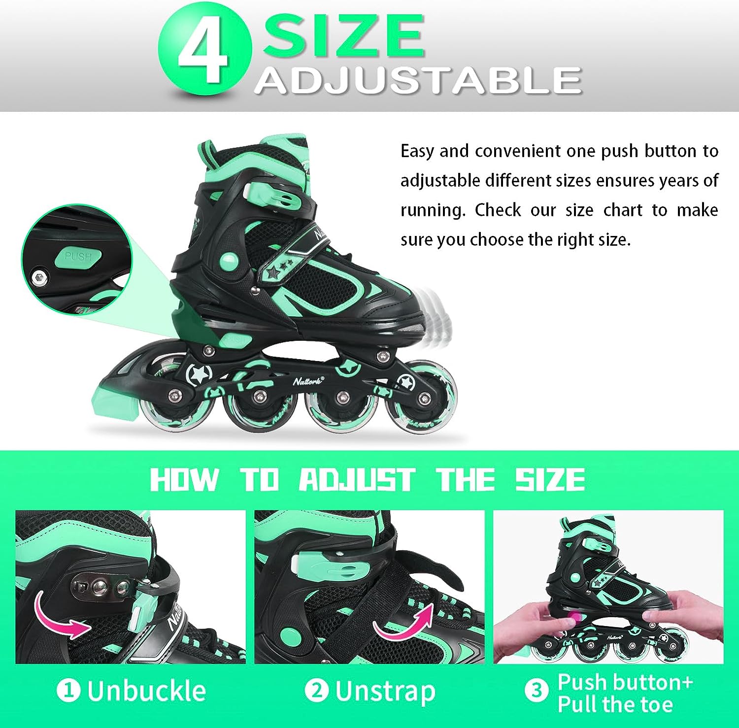 Most Nattork skates are adjustable across 4 sizes, so they can grow with your child — simply press the size-adjust button to extend the skate as their feet grow.