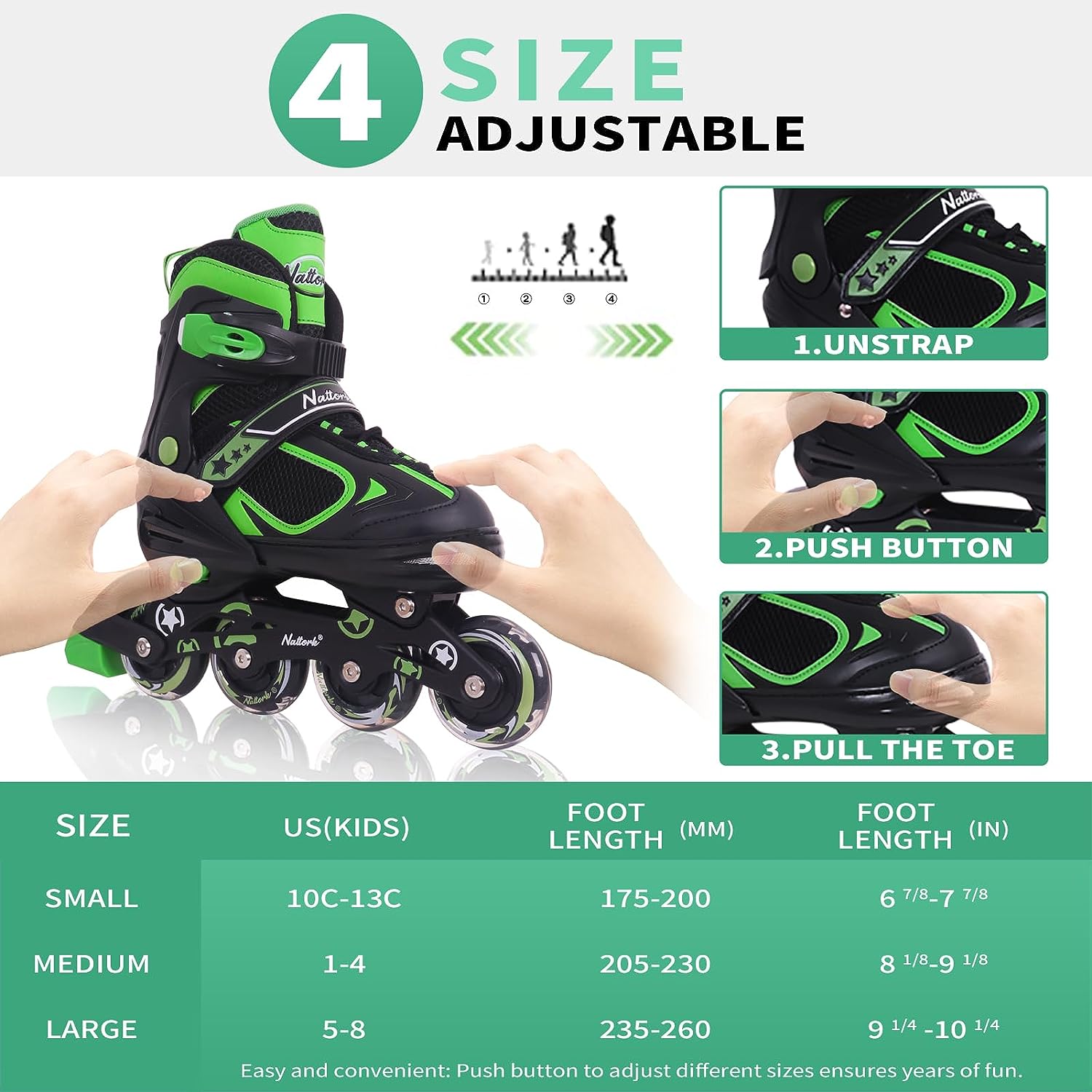 Most Nattork skates are adjustable across 4 sizes, so they can grow with your child — simply press the size-adjust button to extend the skate as their feet grow.