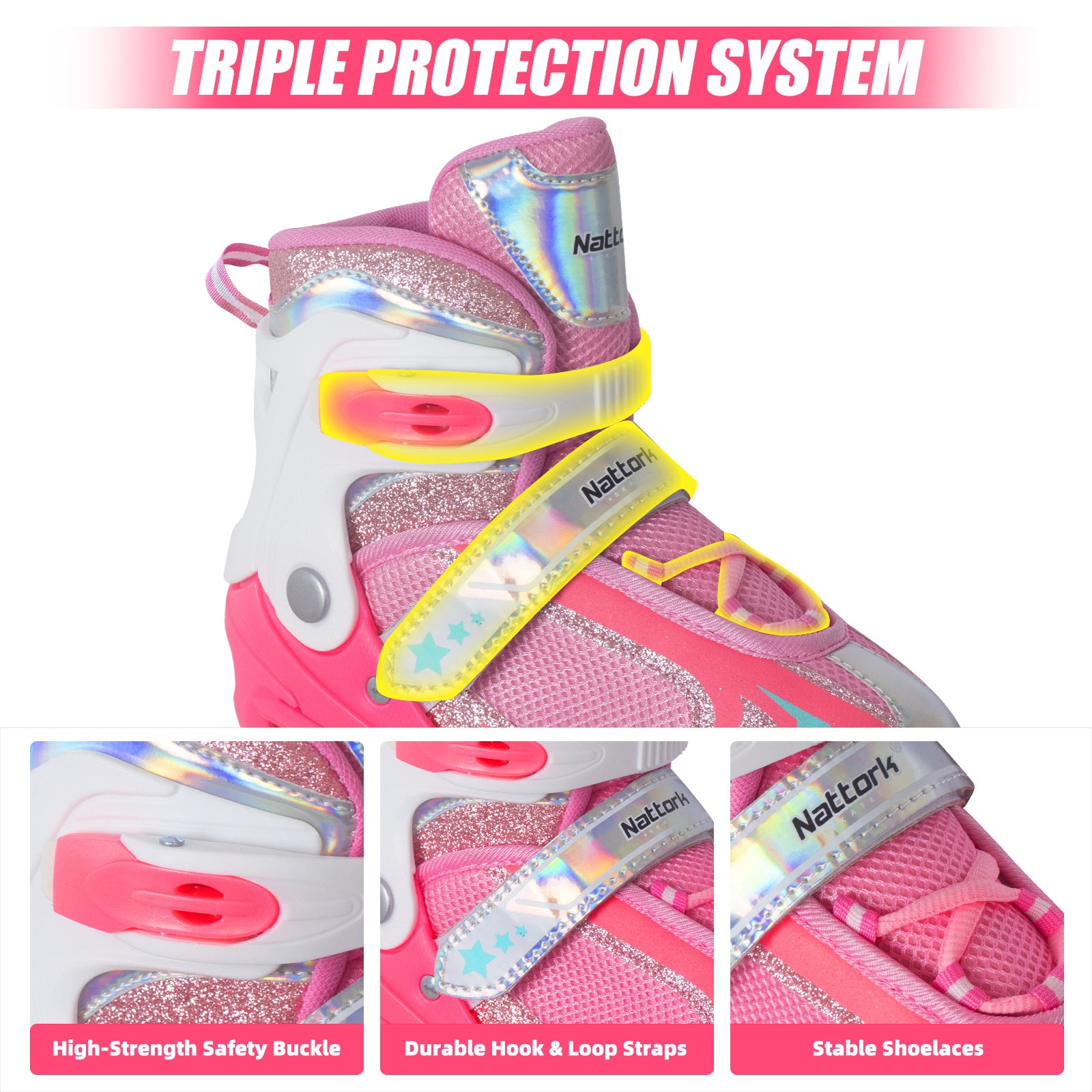 The Nattork Kids inline skates epitomize both durability and performance. Furnished with high-elasticity wheels and ABEC-7 bearings, these skates guarantee a consistent and smooth glide across diverse terrains, empowering young skaters to broaden their skating horizons with confidence.