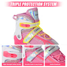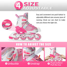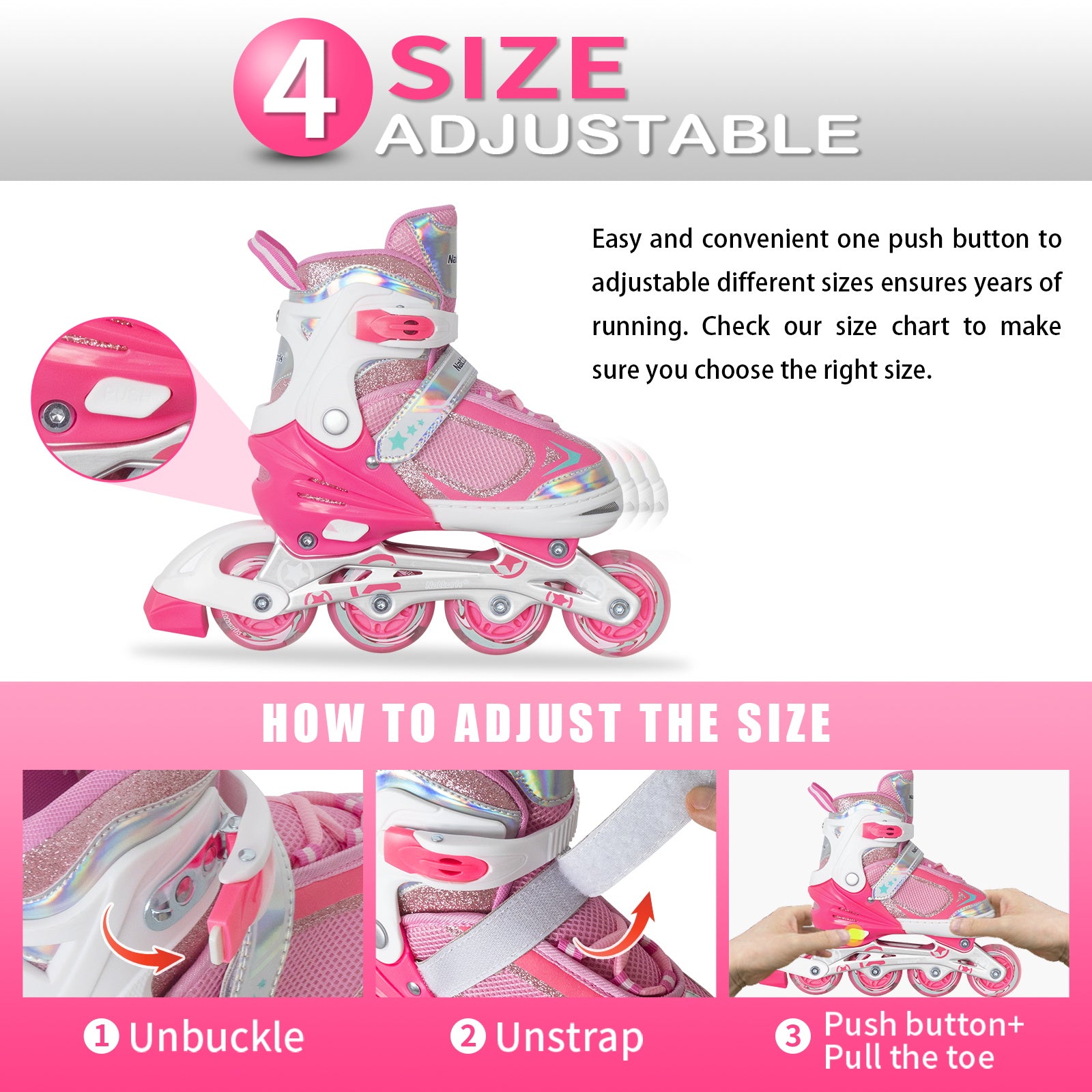 These skates boast remarkable adjustability, presenting four distinct size variations. This eliminates the worries of acquiring the wrong size or the skates being quickly too small for your child's rapidly growing feet. Thanks to the effortless ONE-PUSH-CHANGE size modification mechanism, finding the ideal fit for ensuring ultimate comfort and stability is a breeze.