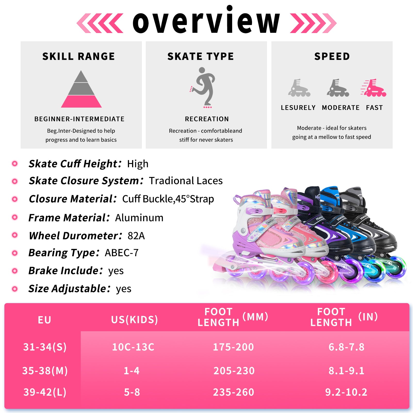 Combined with a push-button size adjustment system. Nattork's inline skates cover FOUR sizes across three ranges: S (10C-13C), M (1-4), and L (5-8). Find the perfect fit with our handy size chart!