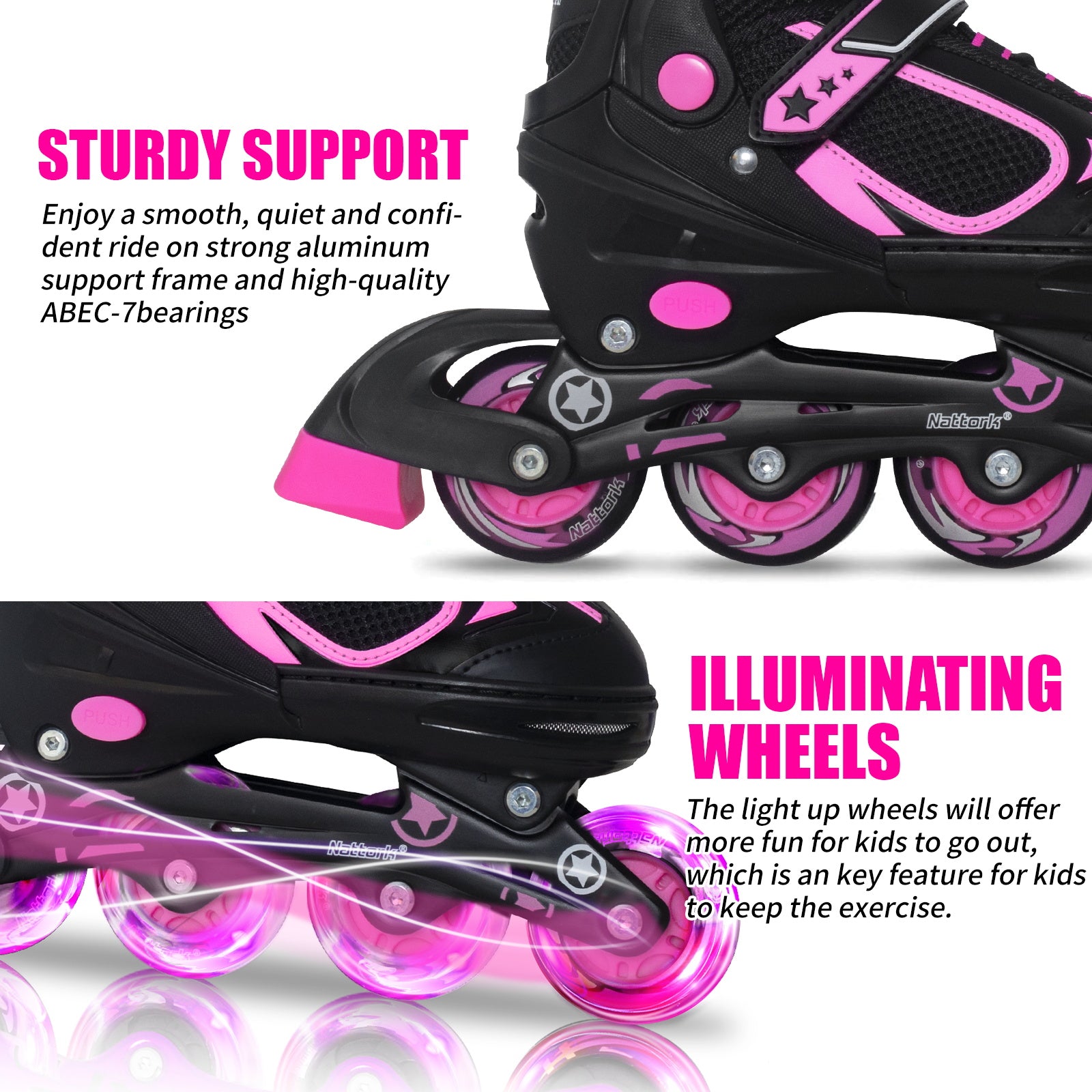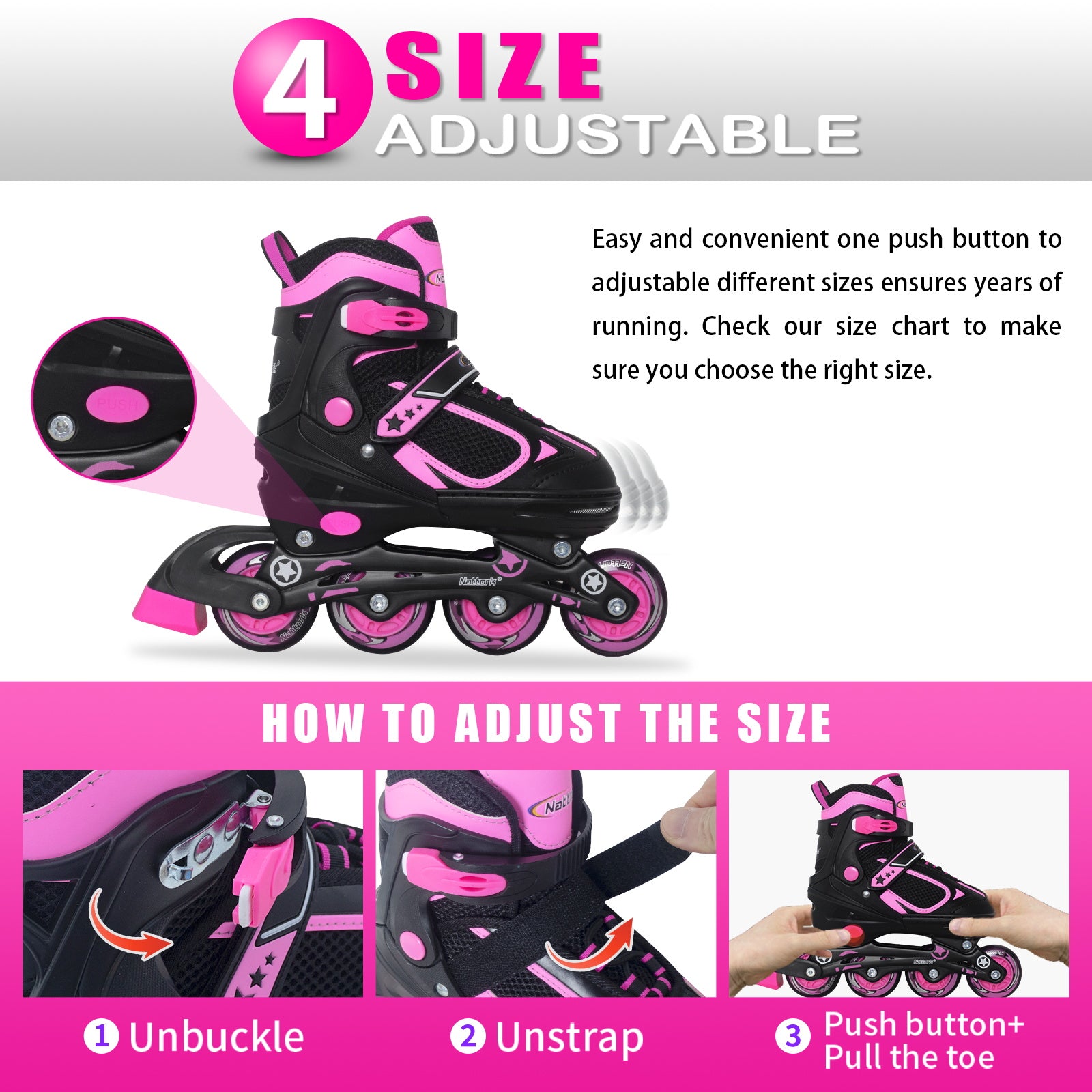 Most Nattork skates are adjustable across 4 sizes, so they can grow with your child — simply press the size-adjust button to extend the skate as their feet grow.