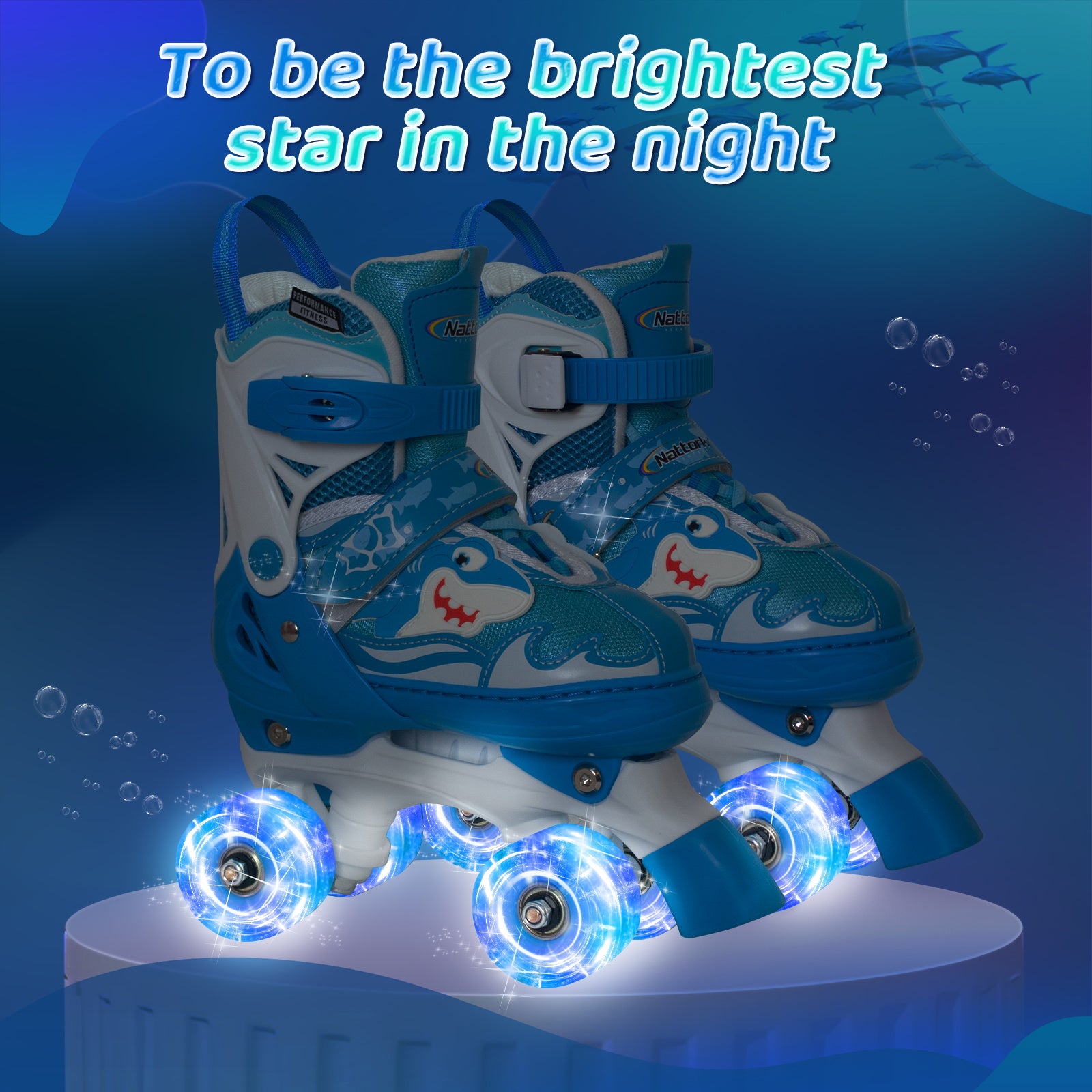 With breathable mesh lining, these skates keep feet cool and comfy, making them perfect for long skating sessions. Whether zooming around the park or skating indoors, the Nattork Adjustable Roller Skates - Blue Shark are your ticket to endless oceanic adventures.