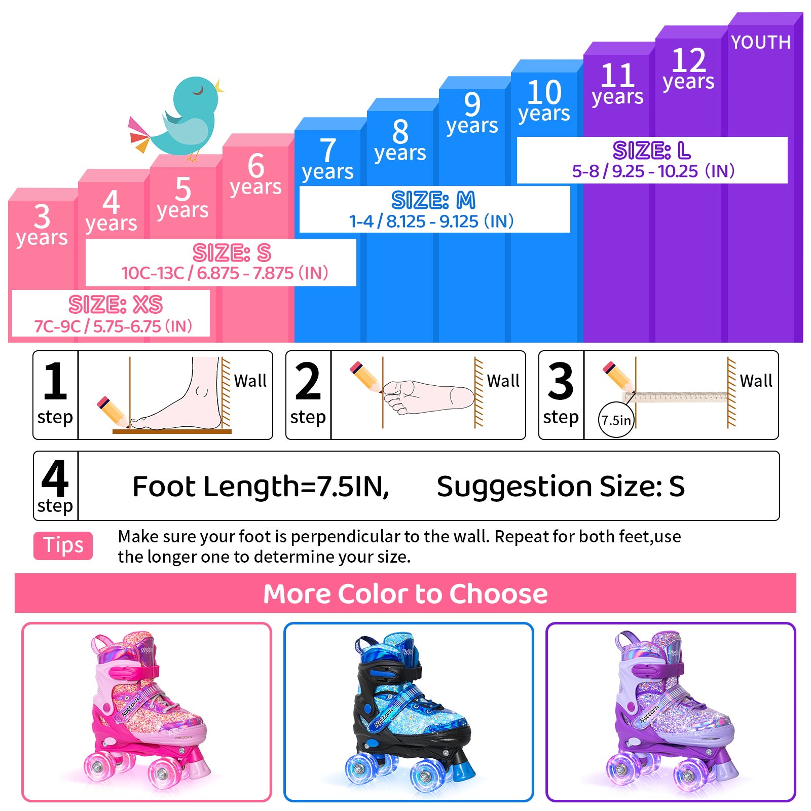 Most Nattork skates are adjustable across 4 sizes, so they can grow with your child — simply press the size-adjust button to extend the skate as their feet grow.