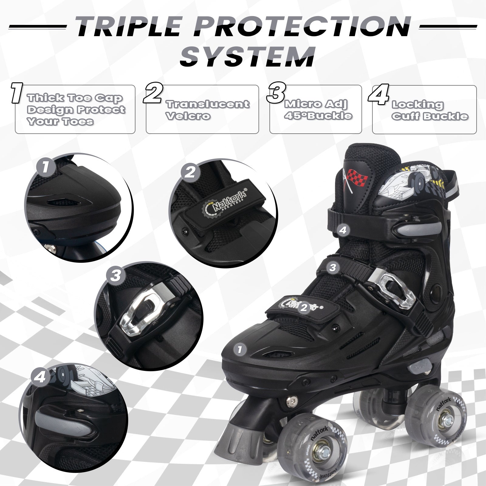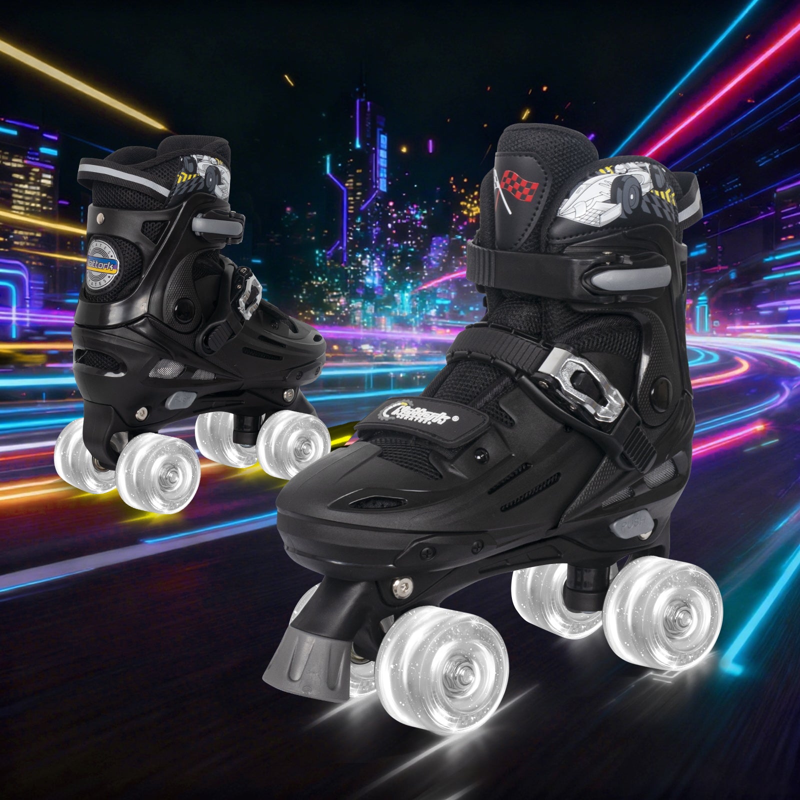 Skate with confidence! Nattork Blade Racers roller skates feature a reinforced safety system combining a sturdy ankle ratchet buckle, strong midfoot power strap, and secure laces to keep feet locked in place. This maximizes stability, reduces wobbling, and is perfect for beginners and experienced skaters alike.