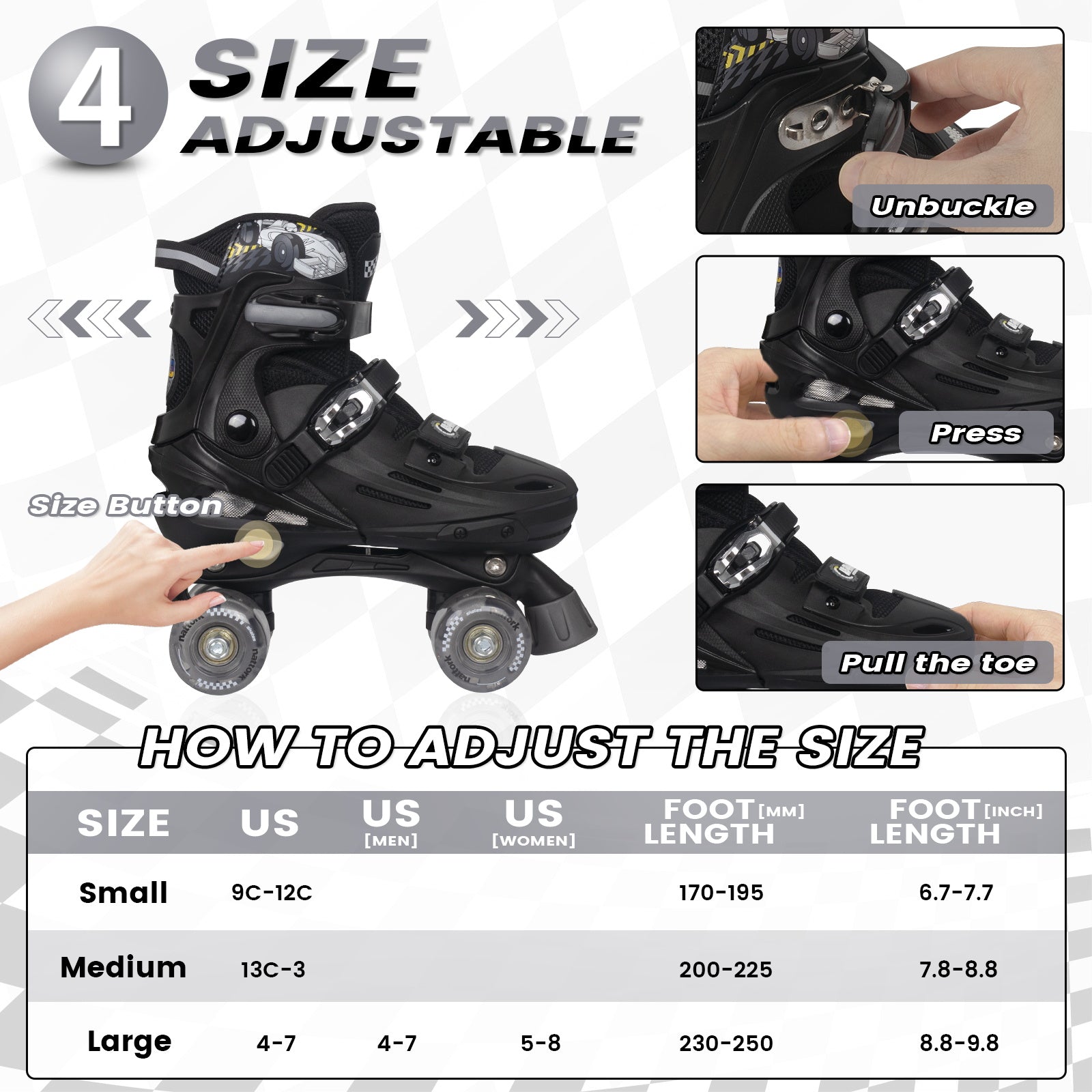 Most Nattork skates are adjustable across 4 sizes, so they can grow with your child — simply press the size-adjust button to extend the skate as their feet grow.