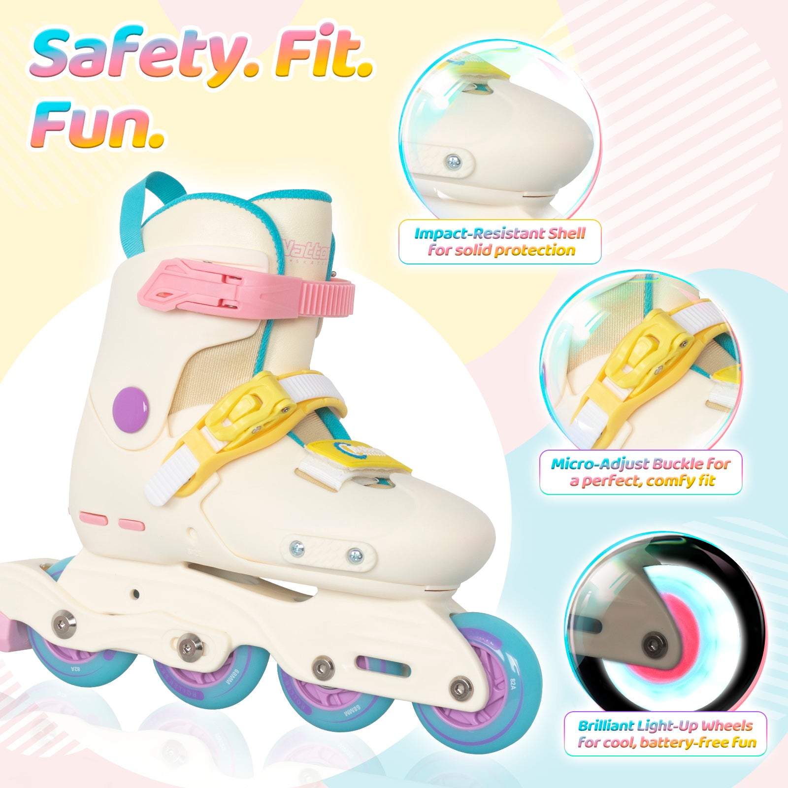 Say goodbye to outgrowing skates too soon! With just one button, these kids inline skates expand across 4 adjustable sizes, making them a long-lasting companion for children aged 4 to 12. Each adjustment ensures a custom, snug fit for safe and confident rides — indoors or outdoors.