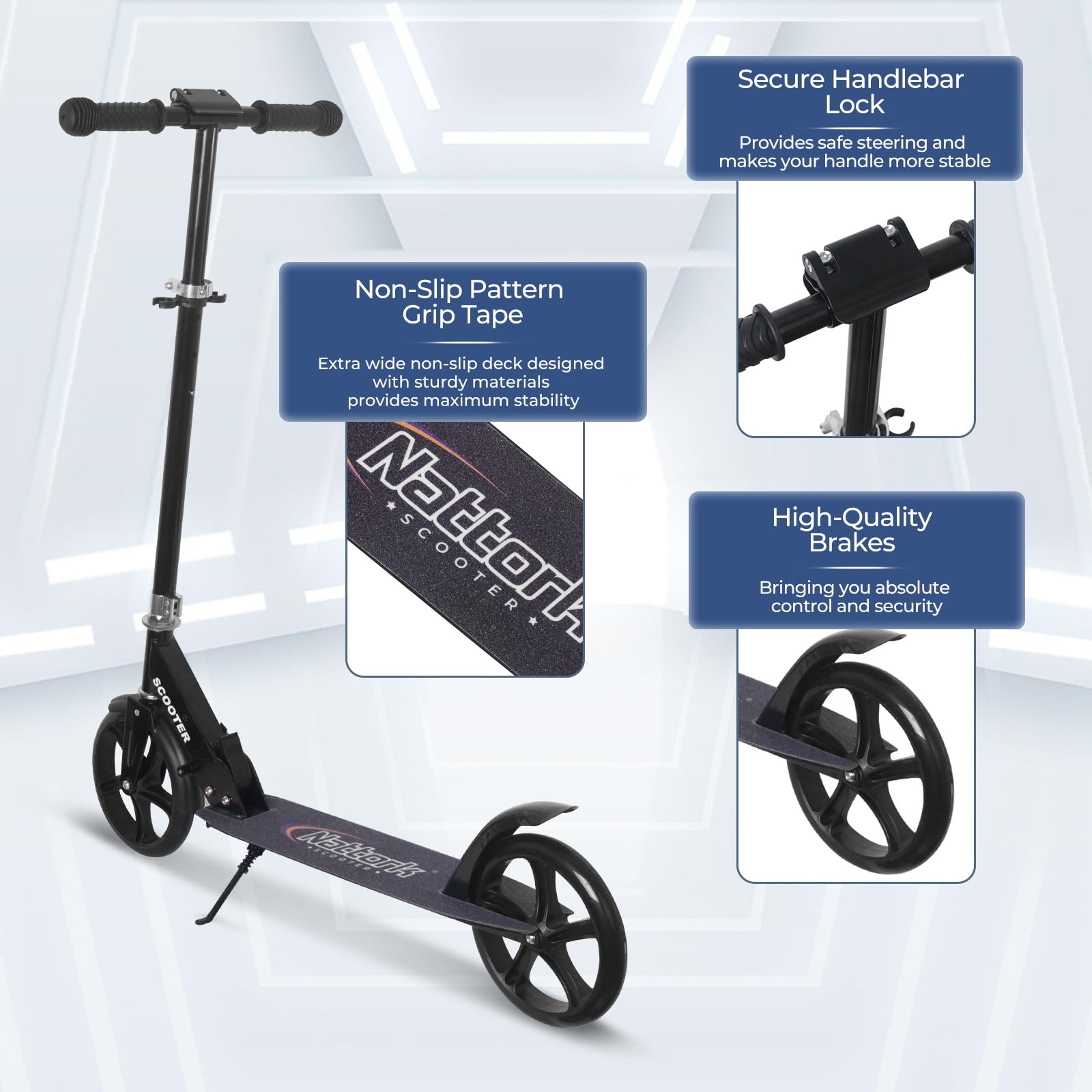 Smooth Ride: Equipped with shockproof suspension and large big wheels, the Nattork scooter ensures a smooth and controlled ride even over uneven terrain. Its advanced cushion-shock system and oversized wheels make it perfect for rougher surfaces, enhancing both comfort and stability.