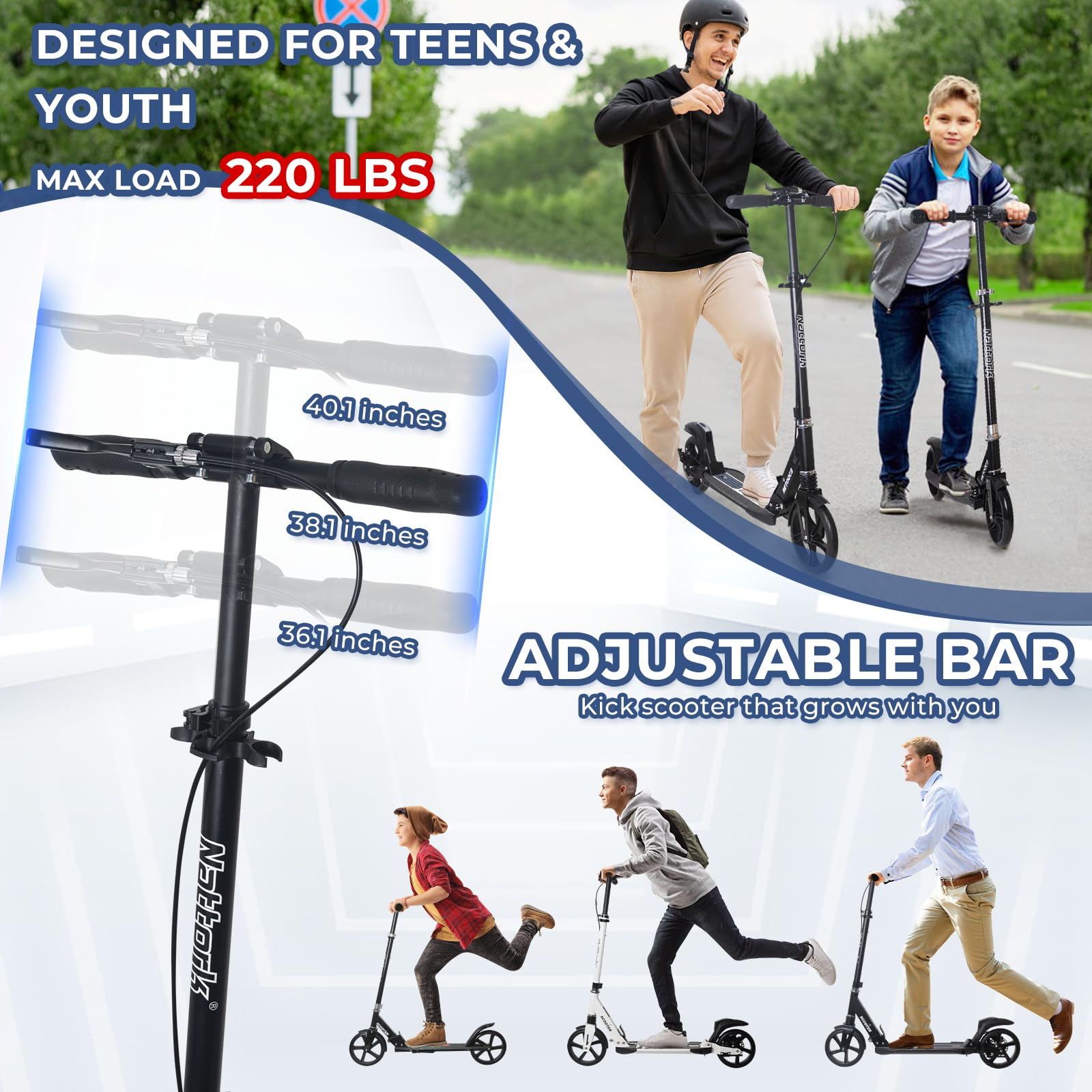 With adjustable handlebars (35-40 inches) and a frame supporting up to 220 lbs, it suits kids, teens, and adults.