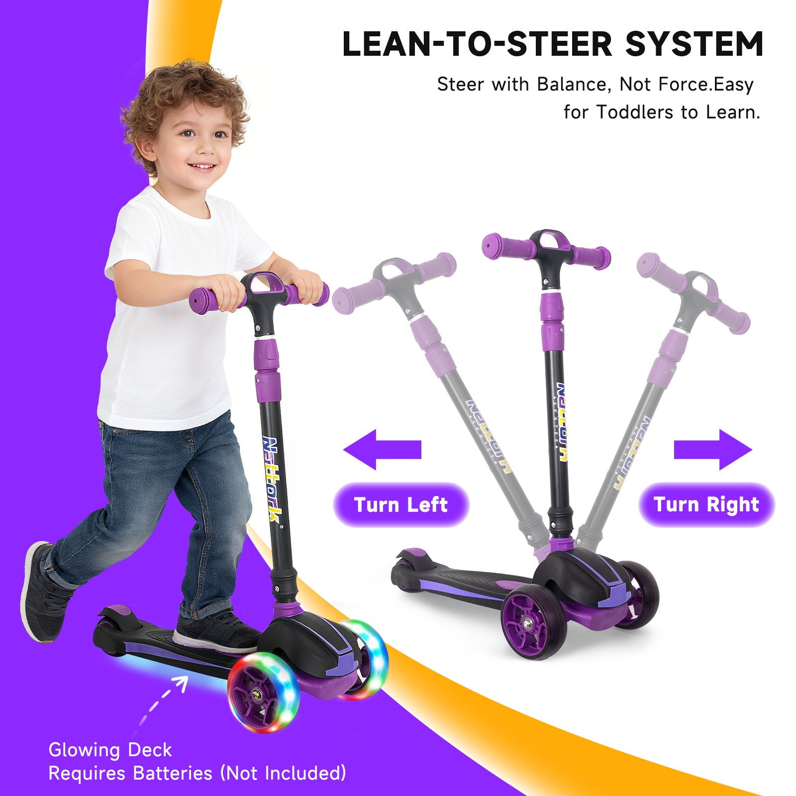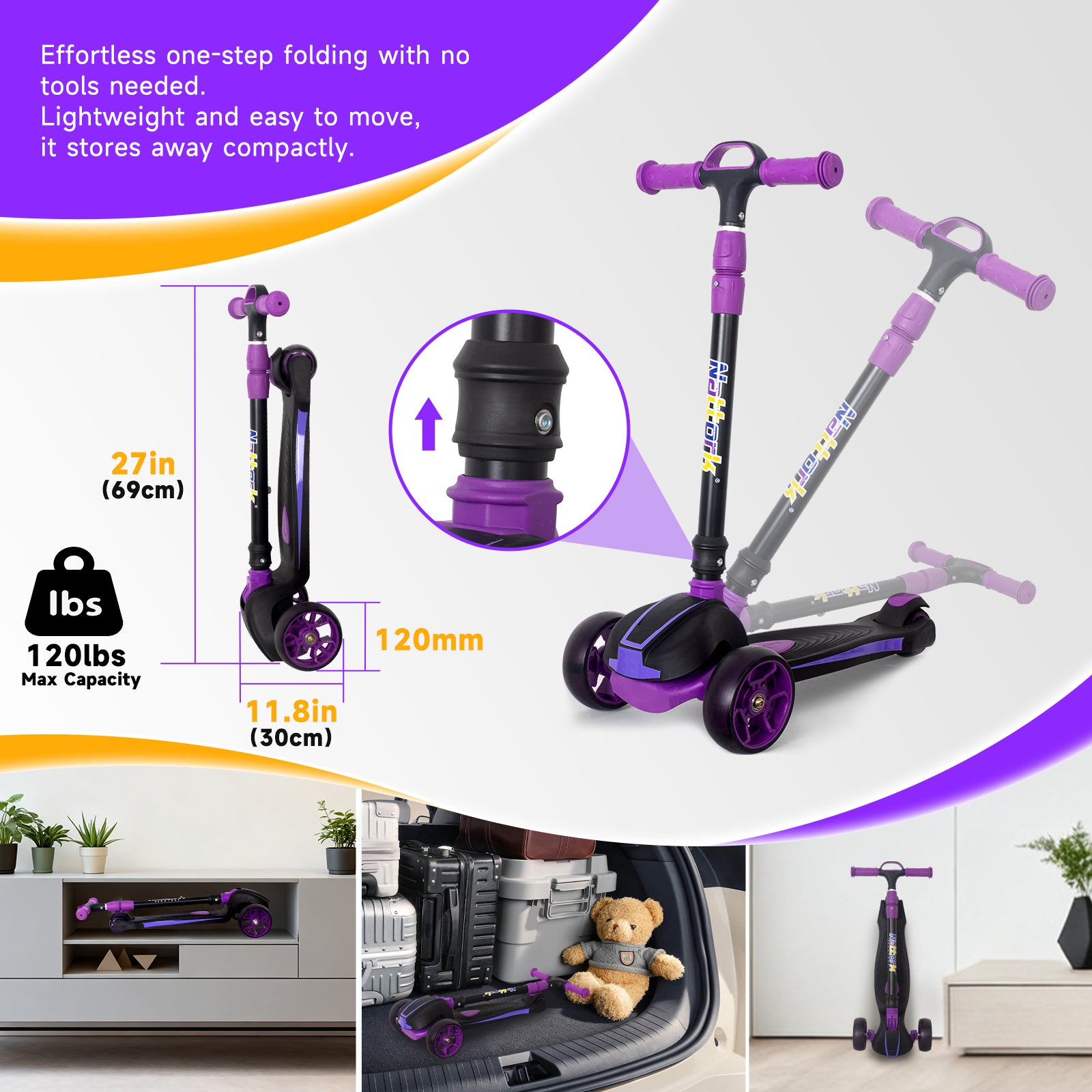 Meet the Nattork Foldable Light-Up 3-Wheel Scooter, the ultimate ride for kids and toddlers ages 3–12. Designed for both indoor and outdoor fun, this vibrant purple scooter blends safety, comfort, and excitement to keep your little one active and smiling every day. Whether they’re just learning to balance or already zooming with confidence, this scooter grows with them — thanks to its adjustable height and sturdy build. With a weight capacity of up to 120 lbs, it’s built to last through years of play and growth.