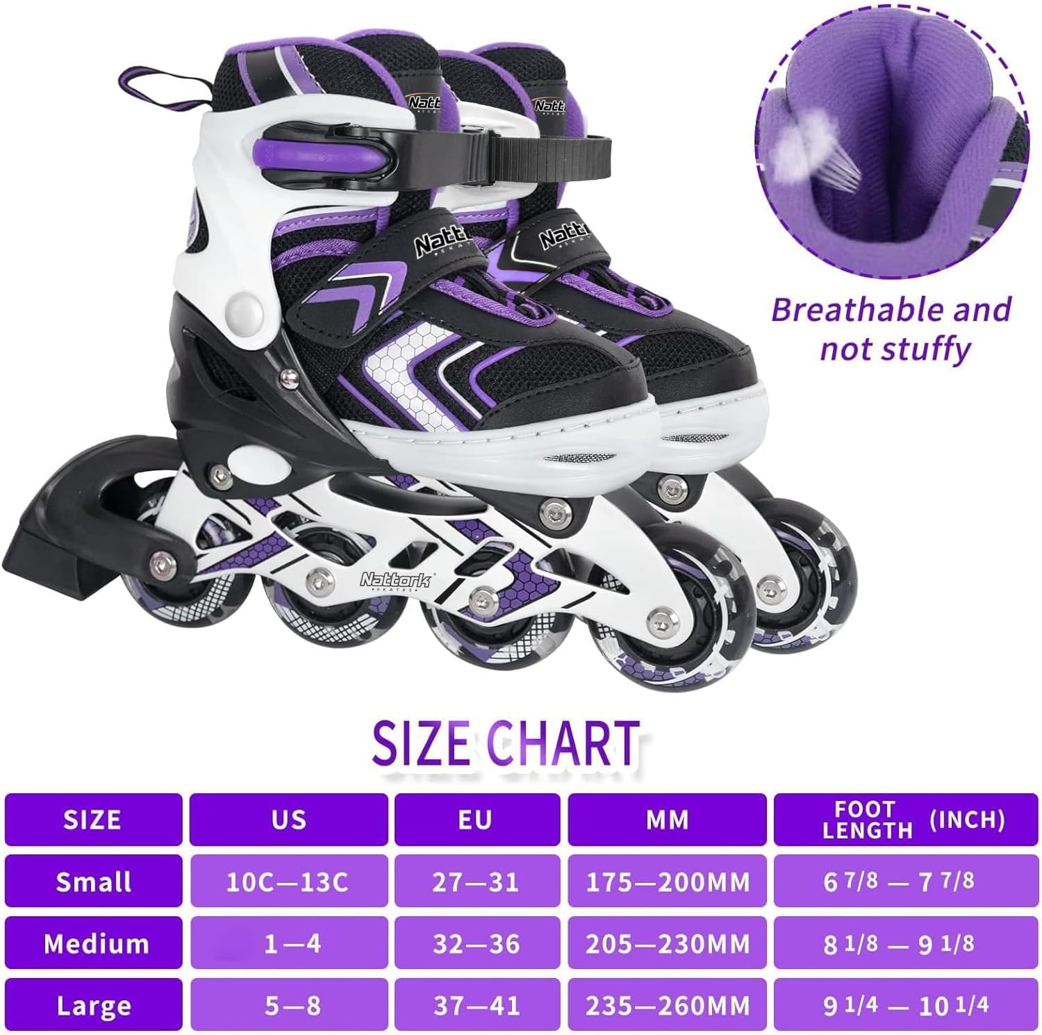 Combined with a push-button size adjustment system. Nattork's inline skates cover FOUR sizes across three ranges: S (10C-13C), M (1-4), and L (5-8). Find the perfect fit with our handy size chart!