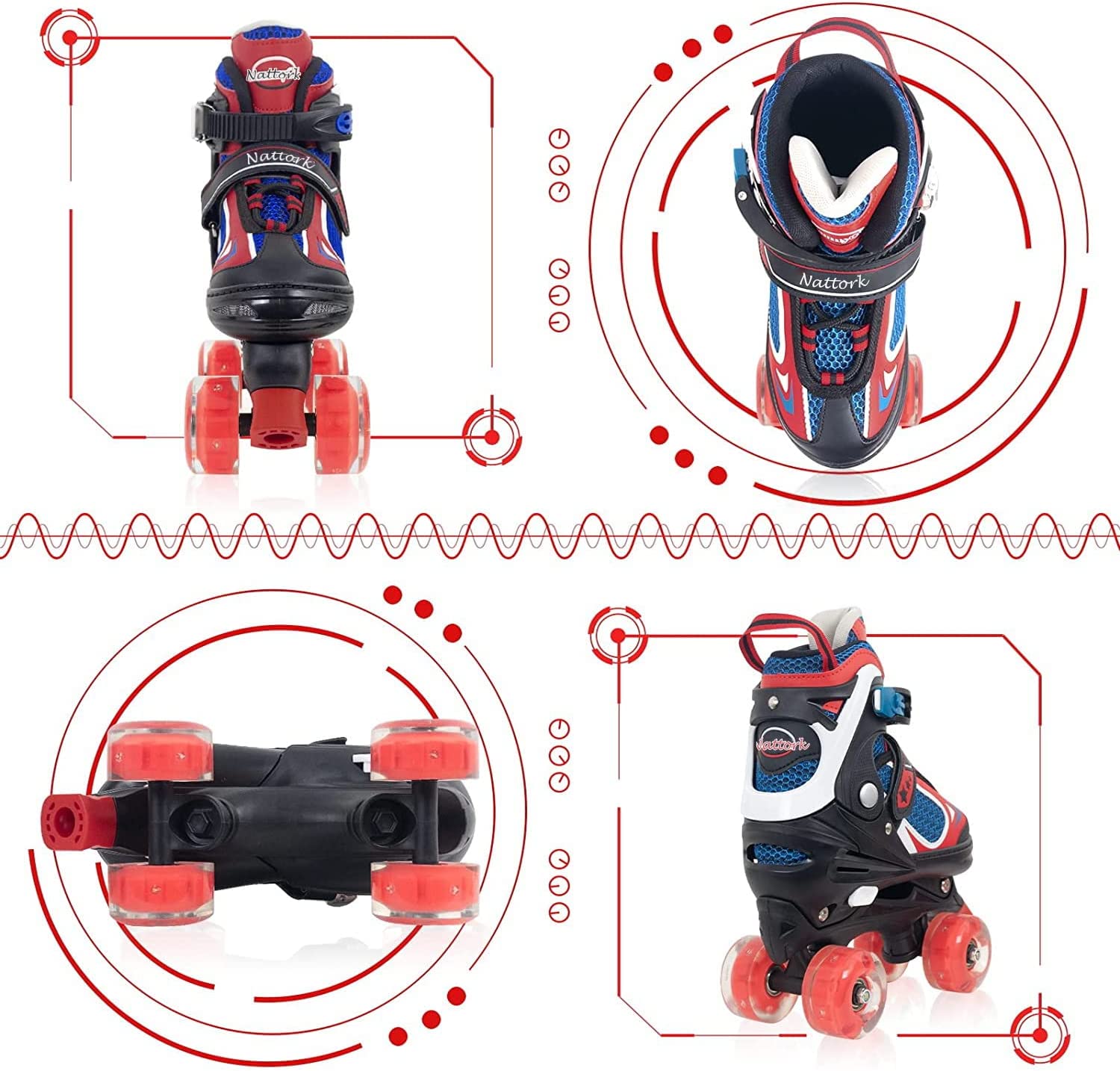 Most Nattork skates are adjustable across 4 sizes, so they can grow with your child — simply press the size-adjust button to extend the skate as their feet grow.