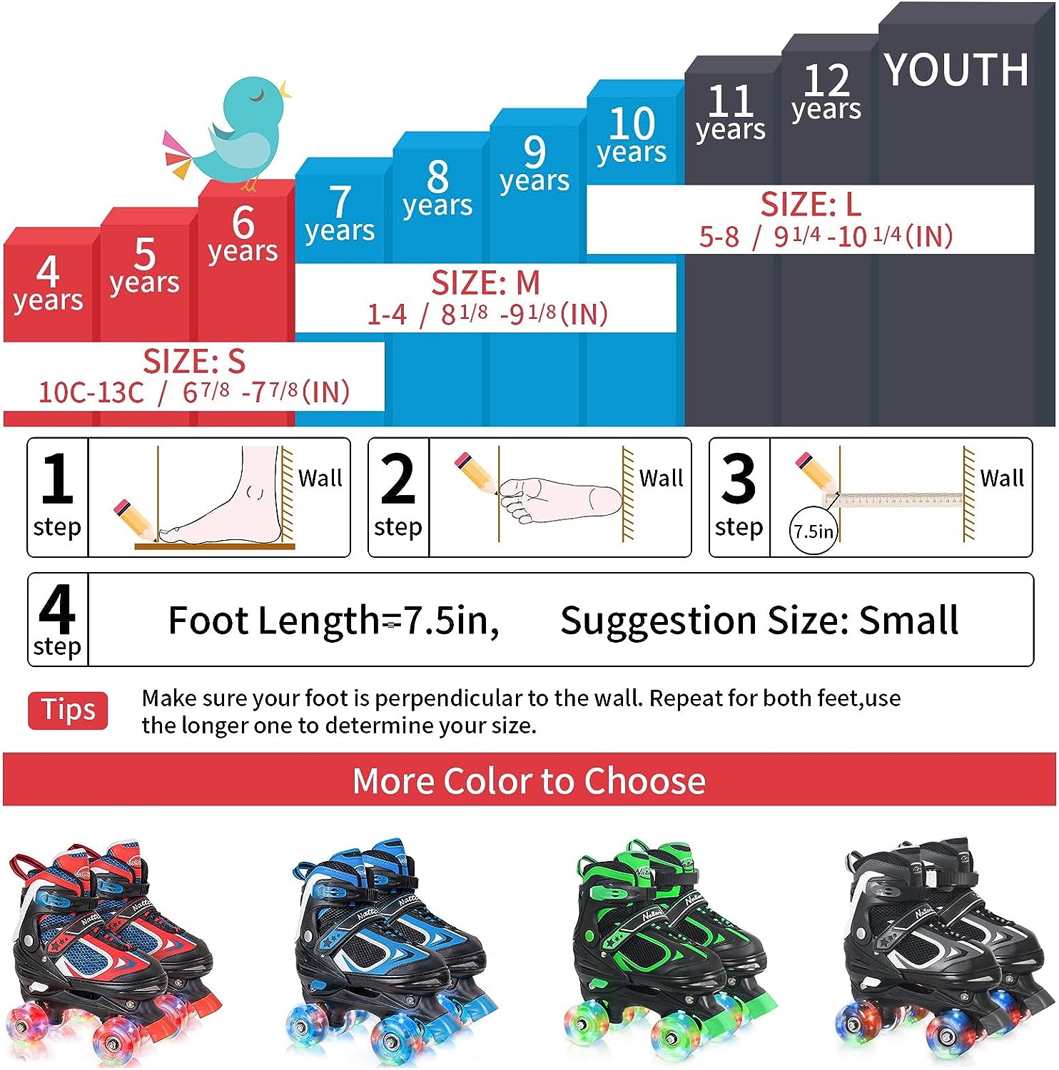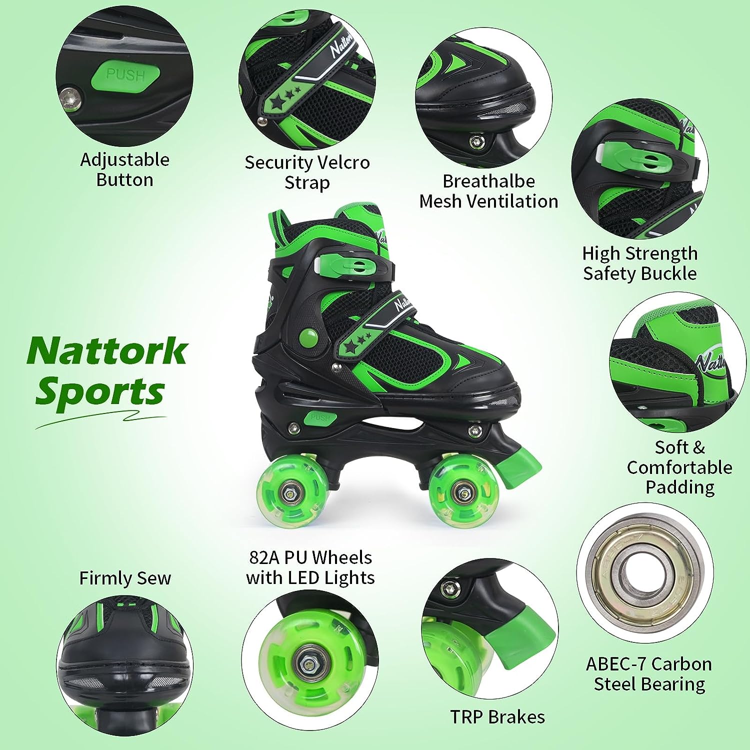 Most Nattork skates are adjustable across 4 sizes, so they can grow with your child — simply press the size-adjust button to extend the skate as their feet grow.