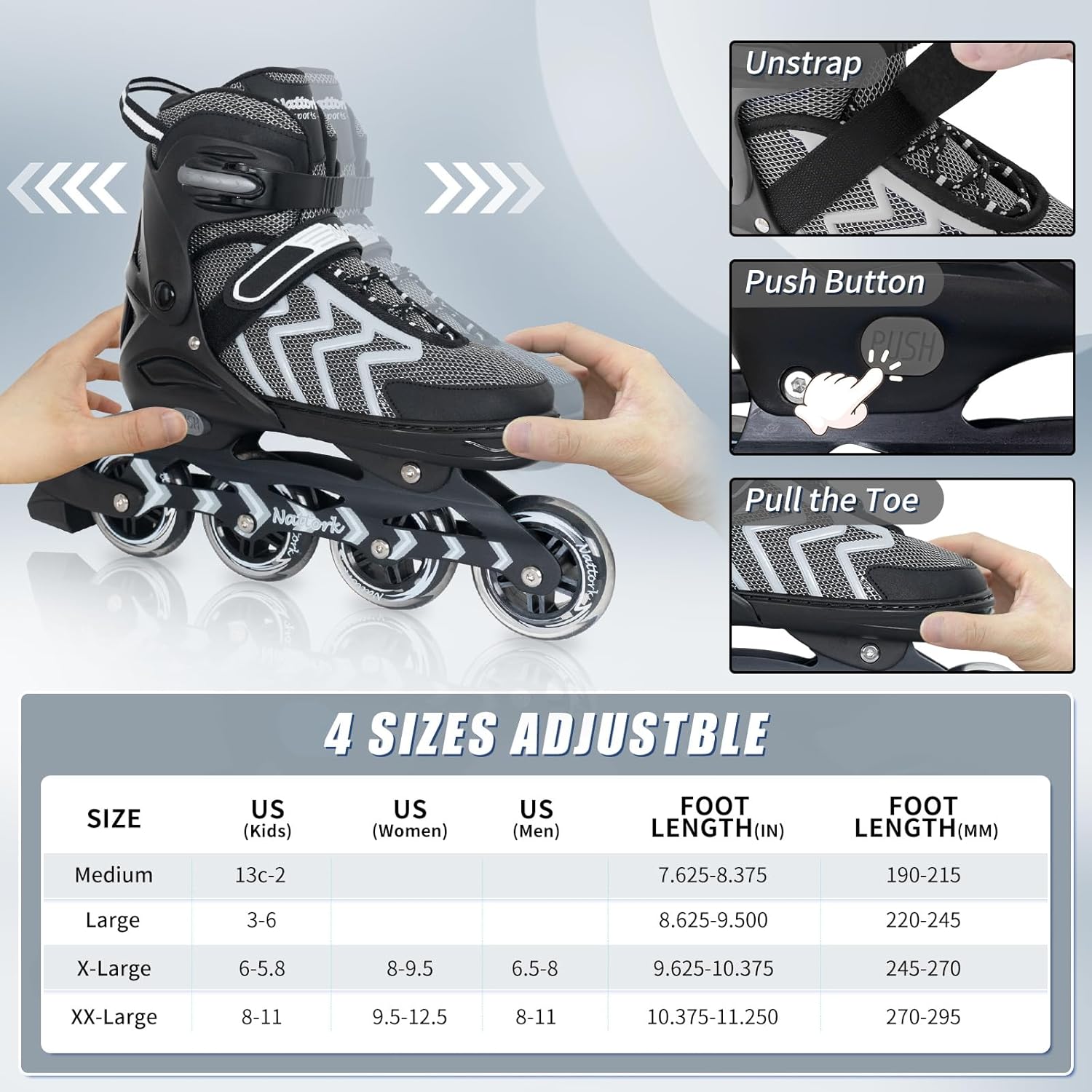 Estos patines también ofrecen la comodidad de una función de cambio de tamaño con solo presionar un botón. Con solo presionar un botón, puede ajustar estos patines a cuatro tamaños diferentes. Esto elimina la preocupación de comprar zapatos que no son del tamaño correcto. O bien, le permite compartir fácilmente la alegría de patinar sobre ruedas con miembros de la familia.