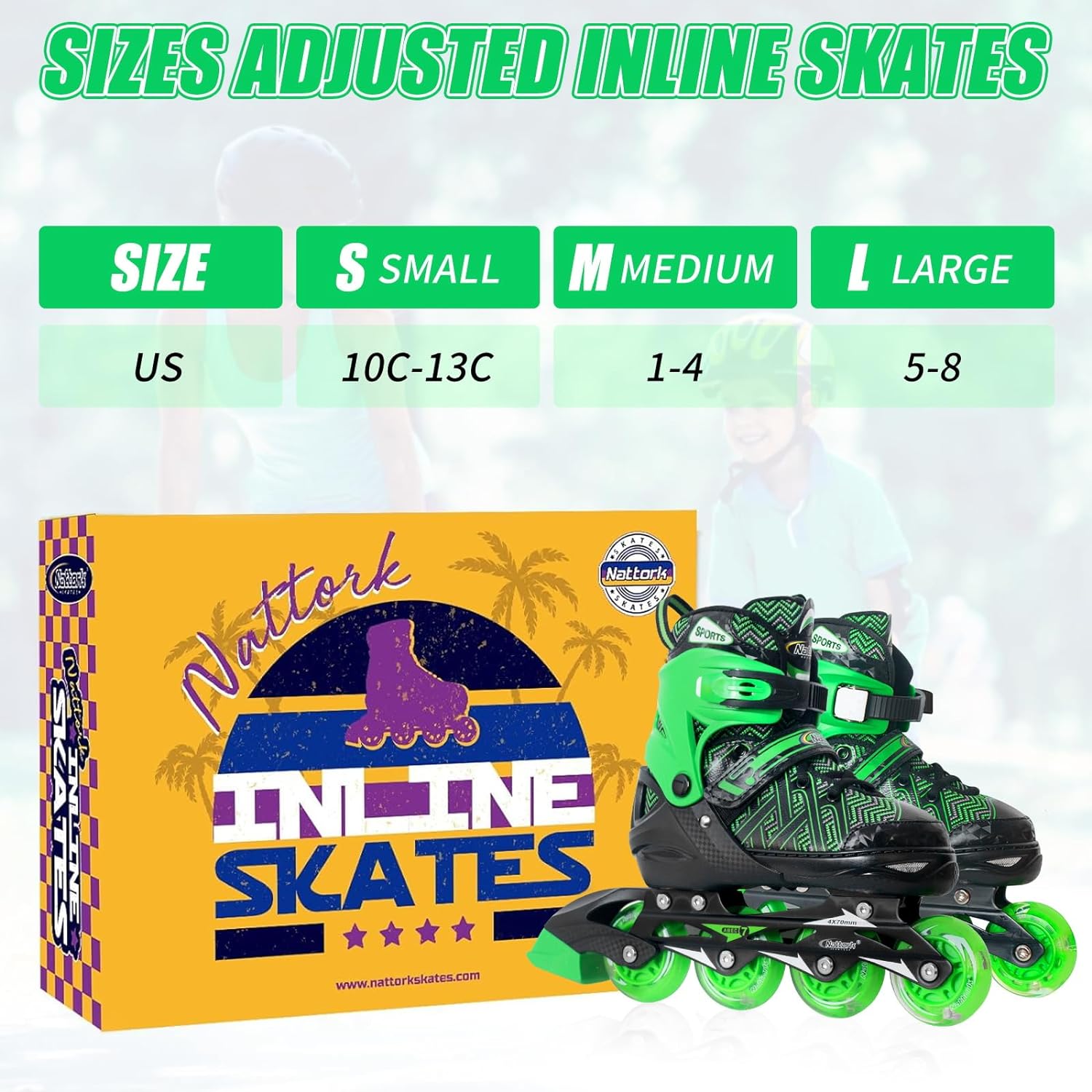 Most Nattork skates are adjustable across 4 sizes, so they can grow with your child — simply press the size-adjust button to extend the skate as their feet grow.