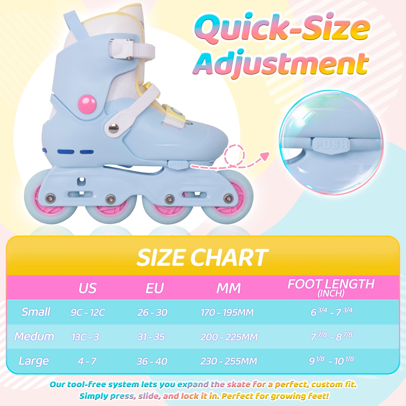 Say goodbye to outgrowing skates too soon! With just one button, these kids inline skates expand across 4 adjustable sizes, making them a long-lasting companion for children aged 4 to 12. Each adjustment ensures a custom, snug fit for safe and confident rides — indoors or outdoors.