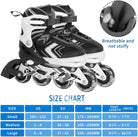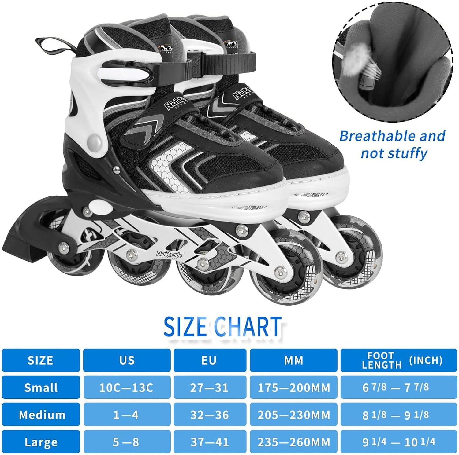 Combined with a push-button size adjustment system. Nattork's inline skates cover FOUR sizes across three ranges: S (10C-13C), M (1-4), and L (5-8). Find the perfect fit with our handy size chart!