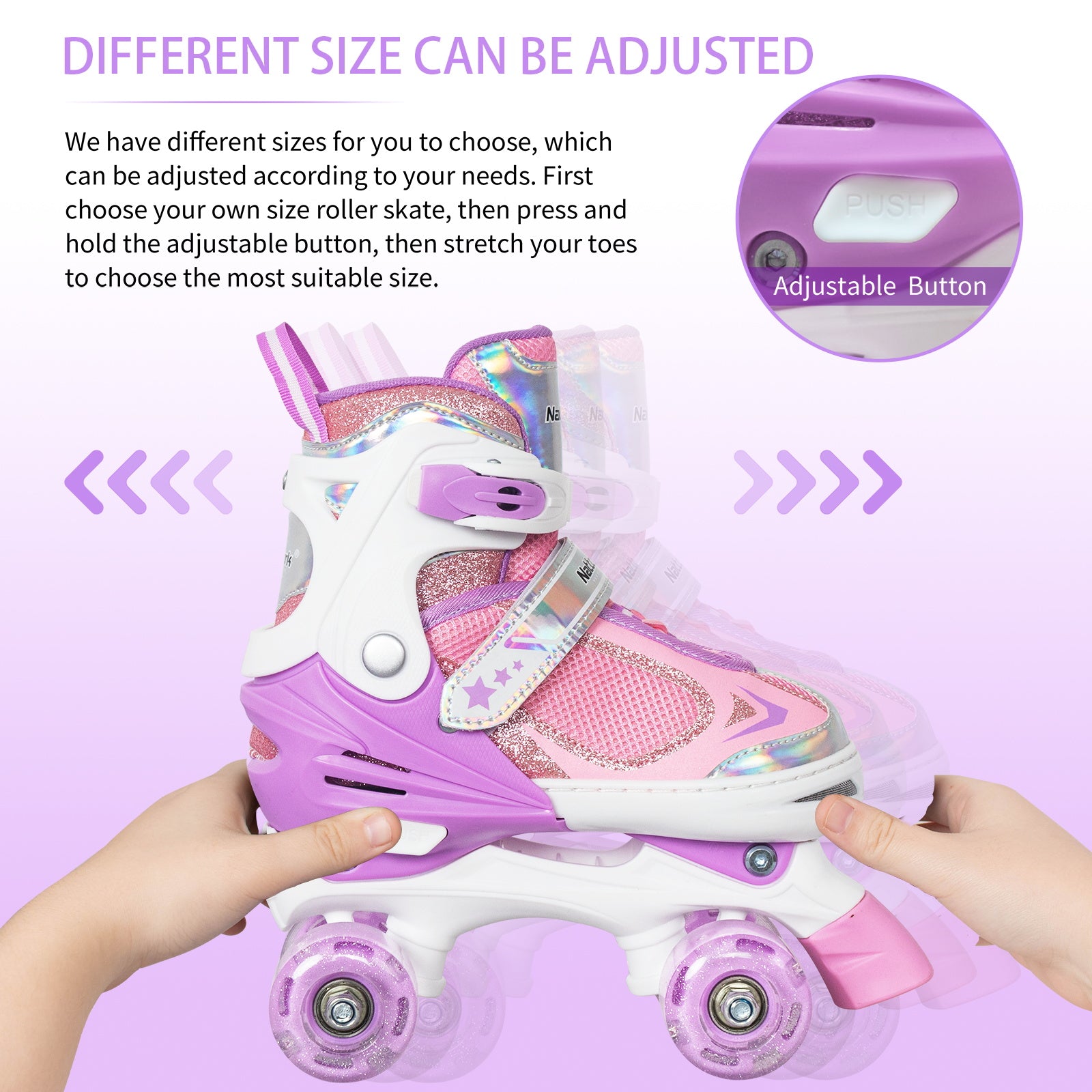 Most Nattork skates are adjustable across 4 sizes, so they can grow with your child — simply press the size-adjust button to extend the skate as their feet grow.