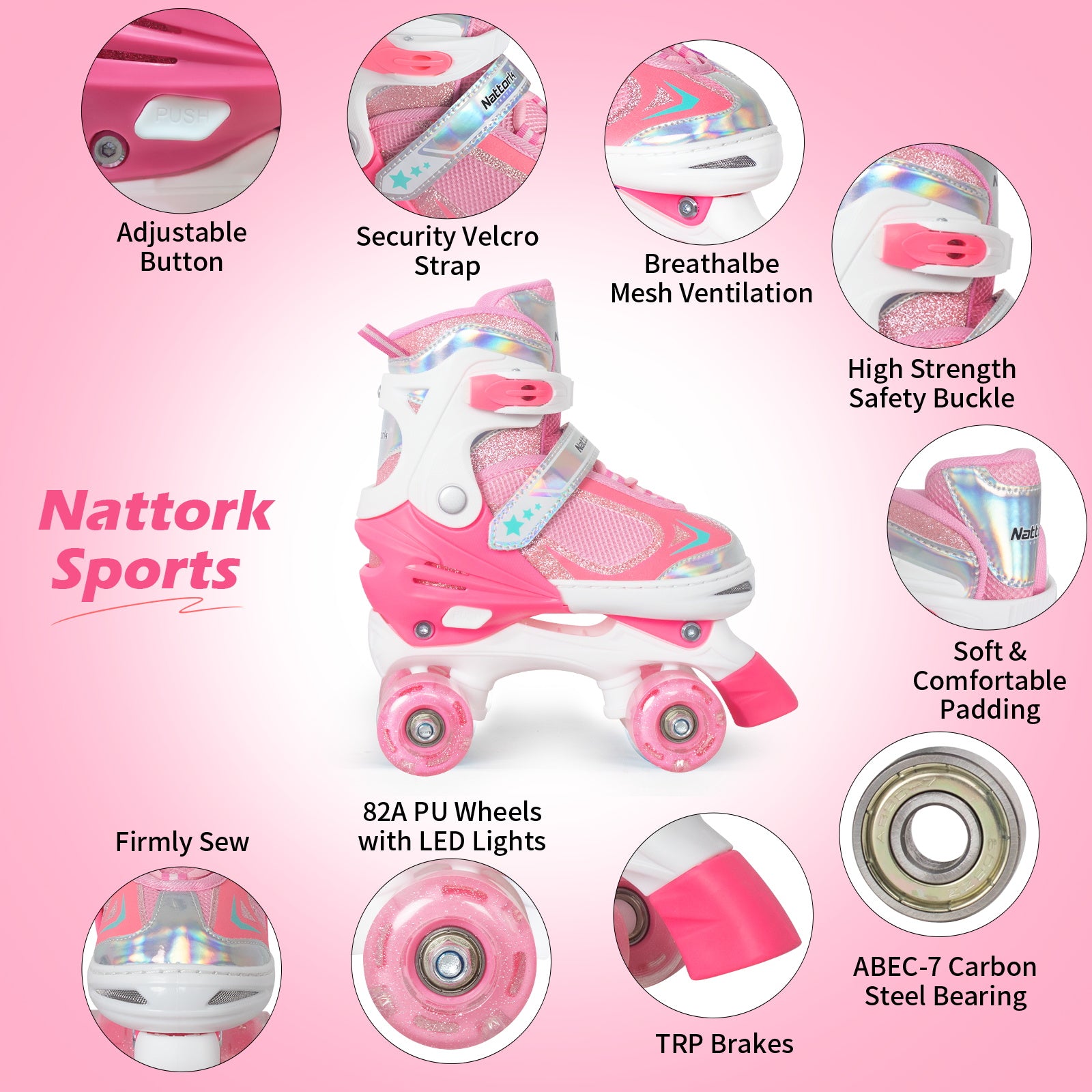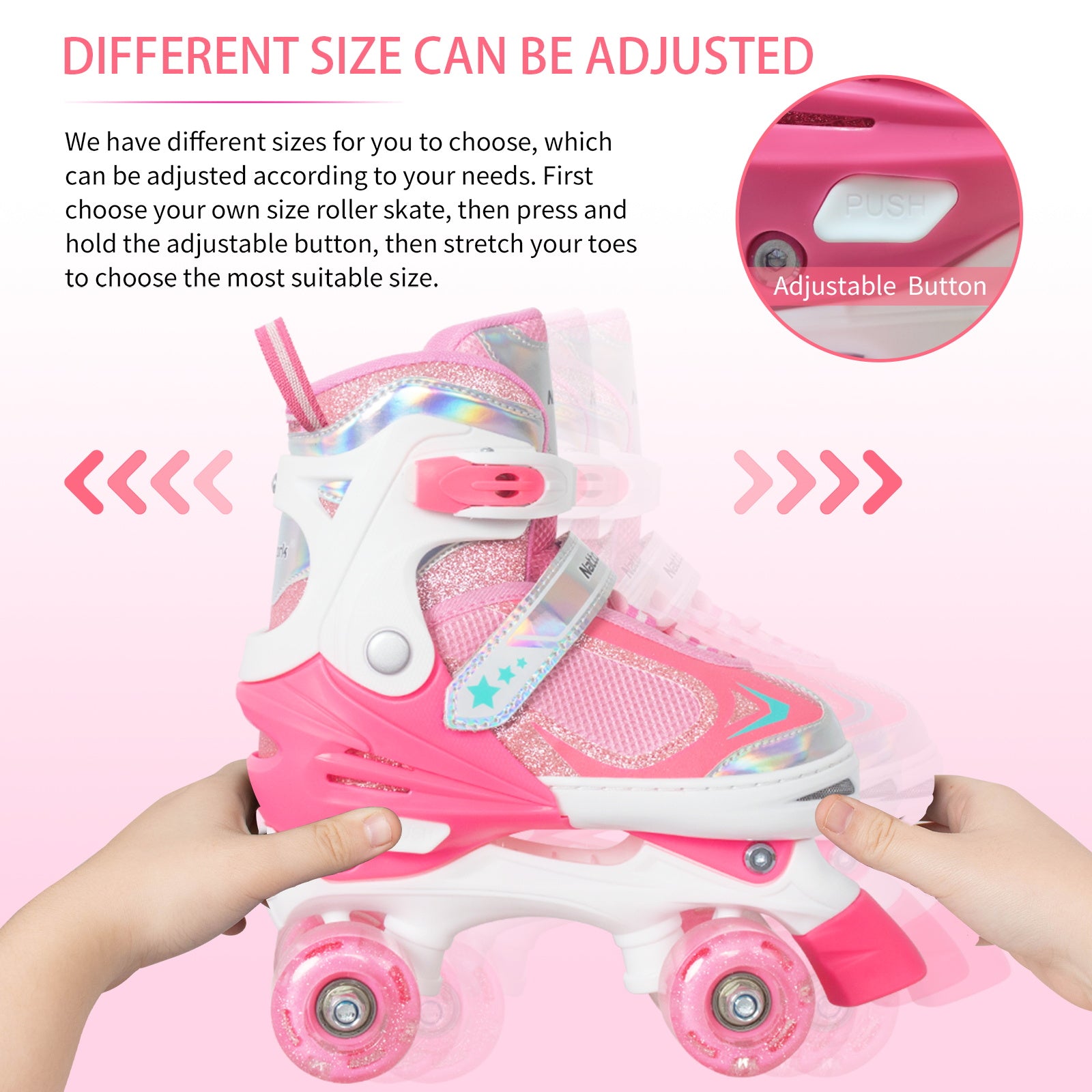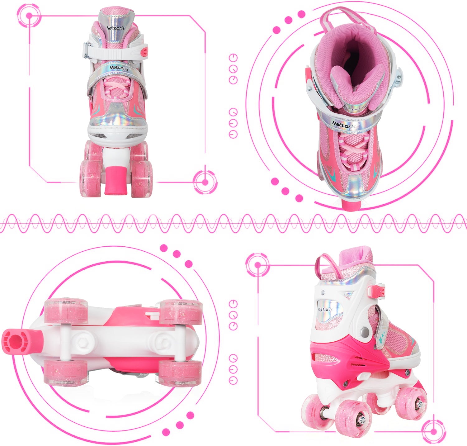 Most Nattork skates are adjustable across 4 sizes, so they can grow with your child — simply press the size-adjust button to extend the skate as their feet grow.