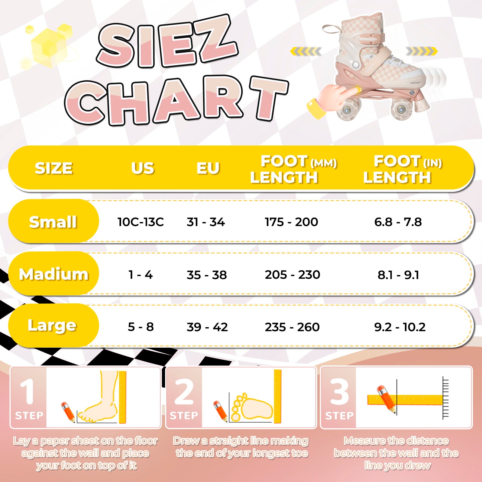 Stand out with a stylish checkerboard pattern available in multiple eye-catching color options. These kids roller skates combine a sleek black frame with a retro-inspired design, making them a favorite among both kids and teens who want to skate in style.