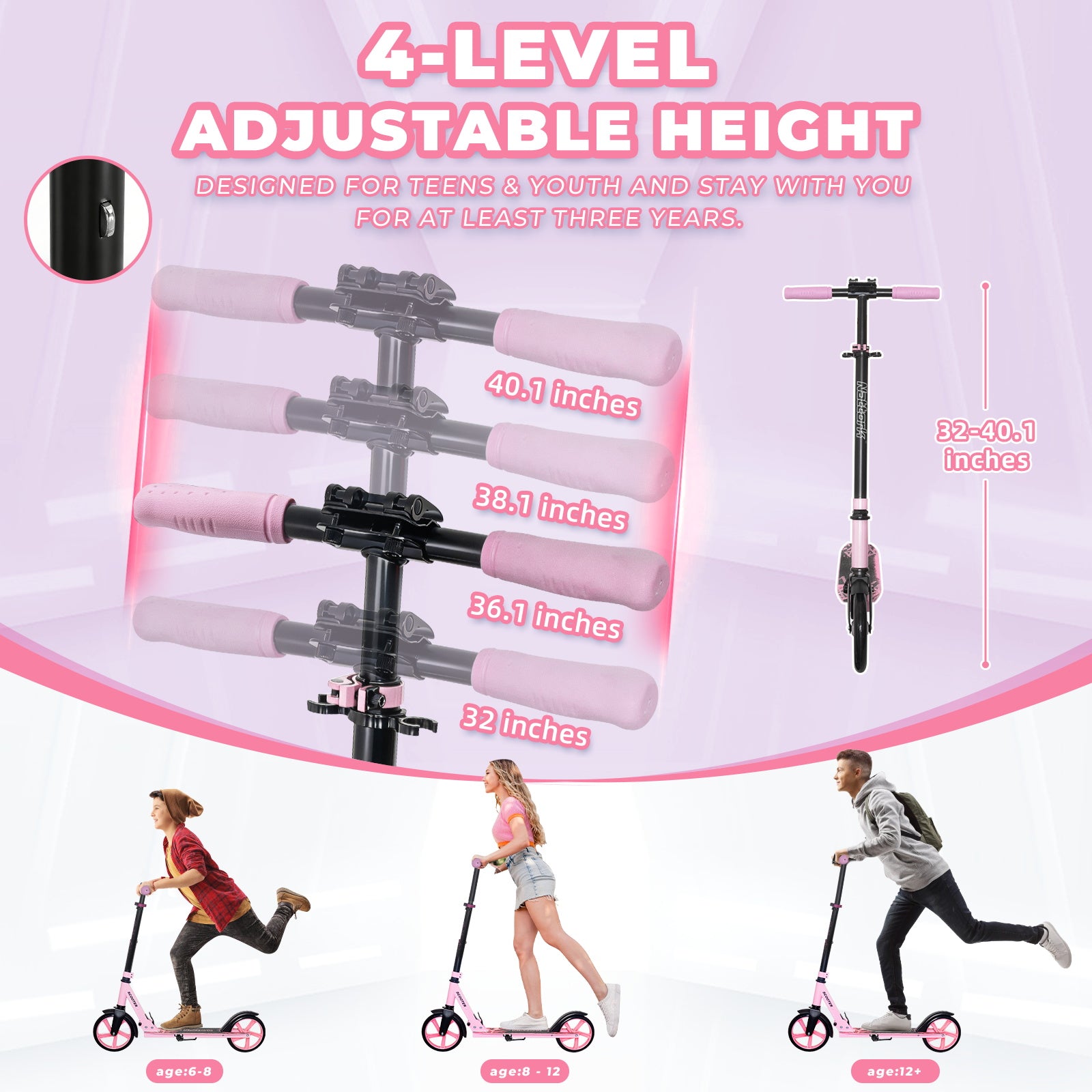With adjustable handlebars (35-40 inches) and a frame supporting up to 220 lbs, it suits kids, teens, and adults.