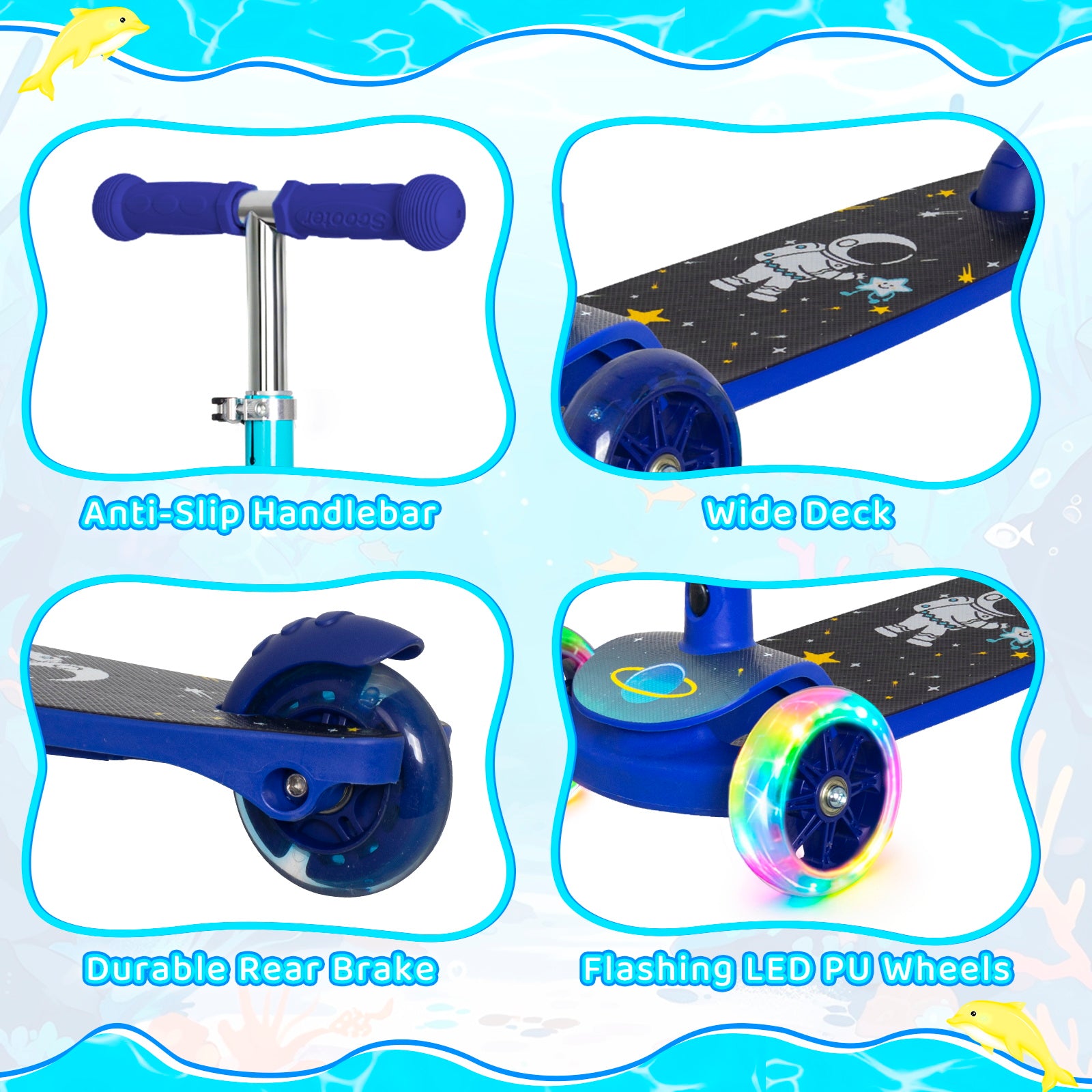 Made with high-quality, durable materials, the Adventure Glow scooter is built for everyday play. The anti-slip deck ensures secure footing, and the reliable rear brake delivers smooth, controlled stopping for worry-free rides.