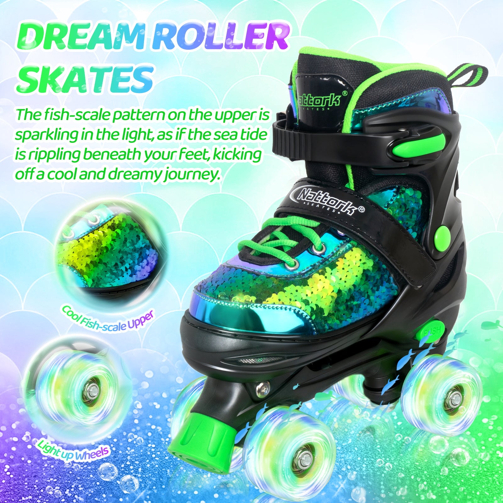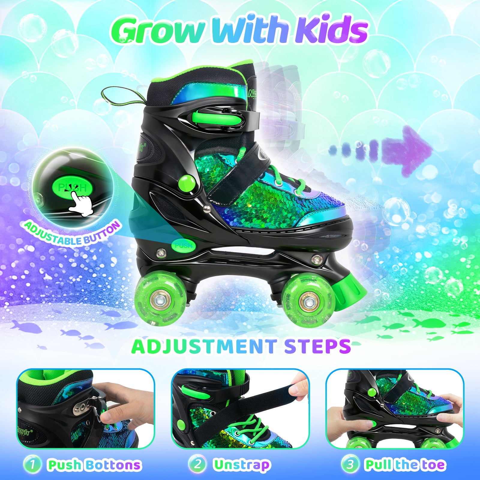 Most Nattork skates are adjustable across 4 sizes, so they can grow with your child — simply press the size-adjust button to extend the skate as their feet grow.
