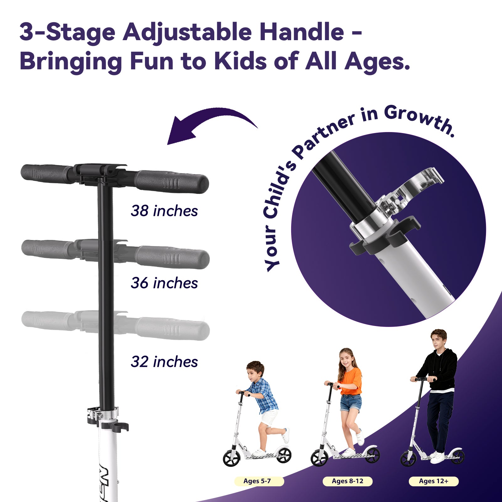 With adjustable handlebars (35-40 inches) and a frame supporting up to 220 lbs, it suits kids, teens, and adults.